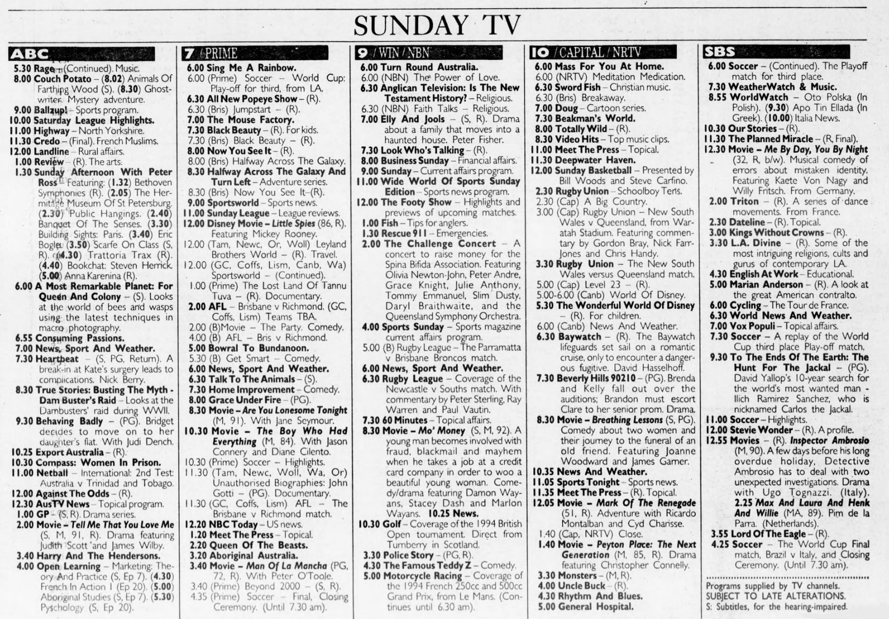 A discussion about the lack of SBS availability in regional areas in 1994 in the ‘Random TV History’ thread when the FIFA World Cup was prompted me to delve into the SMH archives and dig this out (Sunday 17 July 1994) for coverage of the final…. Seems like all Prime markets aired it as I imagine Prime wouldn’t have the ability to split it’s signal that precisely to only those areas not served by SBS.