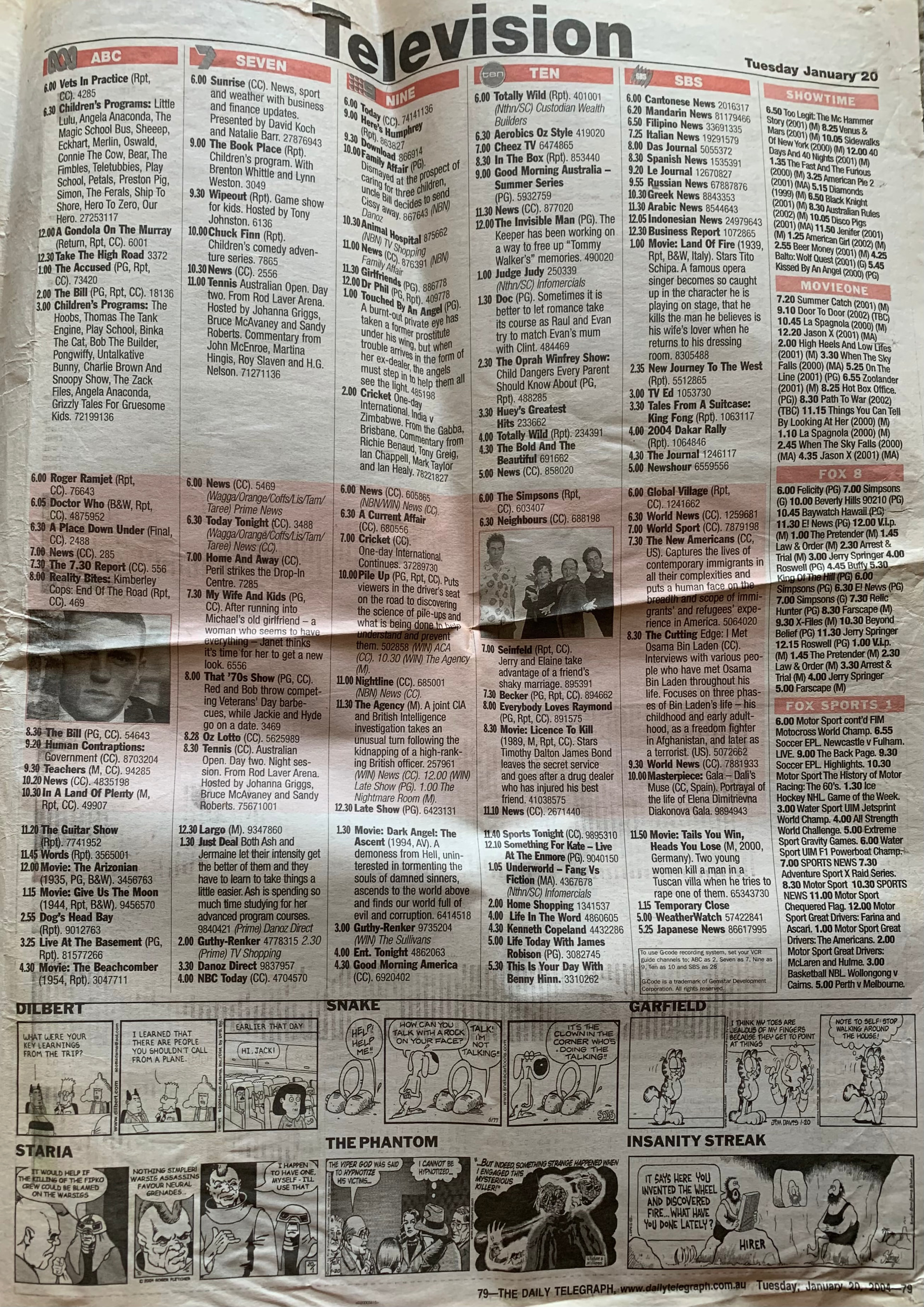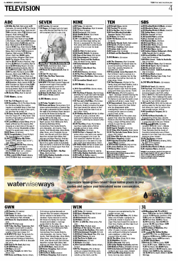 Today’s TV: Monday, January 16, 2006, Perth, Western Australia, Australia