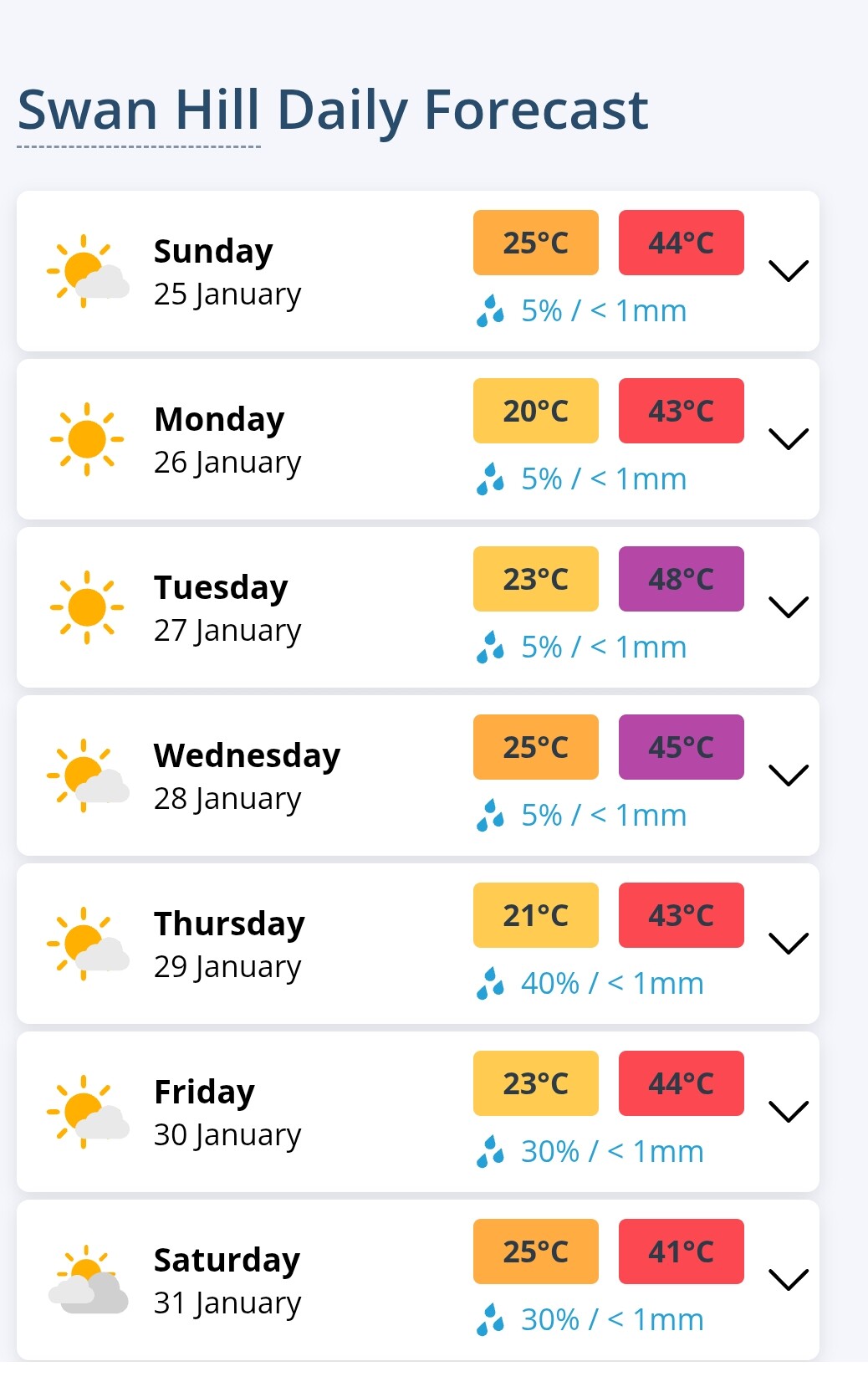 Swan Hill forecast for Tuesday has been bouncing between 47 and 48C all week. Here is the 7 day outlook I captured earlier today.