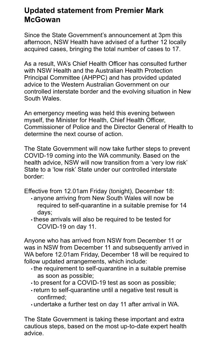 On the back of tonight’s CHO hook up, WA has locked down further. Anyone arriving from 12.01 tonight from Sydney must quarantine for 14 days.