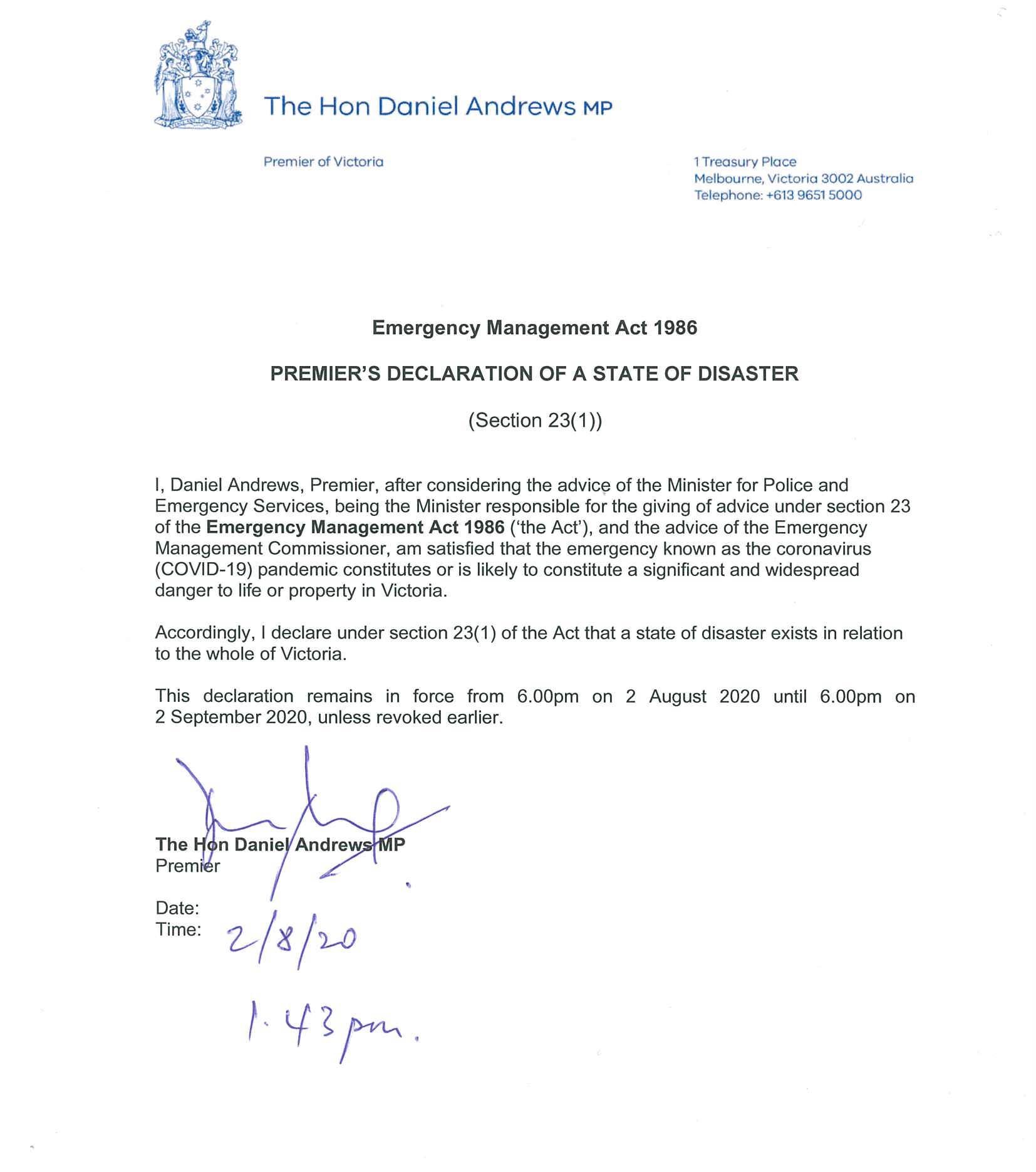 State of Disaster to remain in force until 6pm on September 2 - I’m presuming this can be extended if need be similar to what they have done with the State of Emergency to date