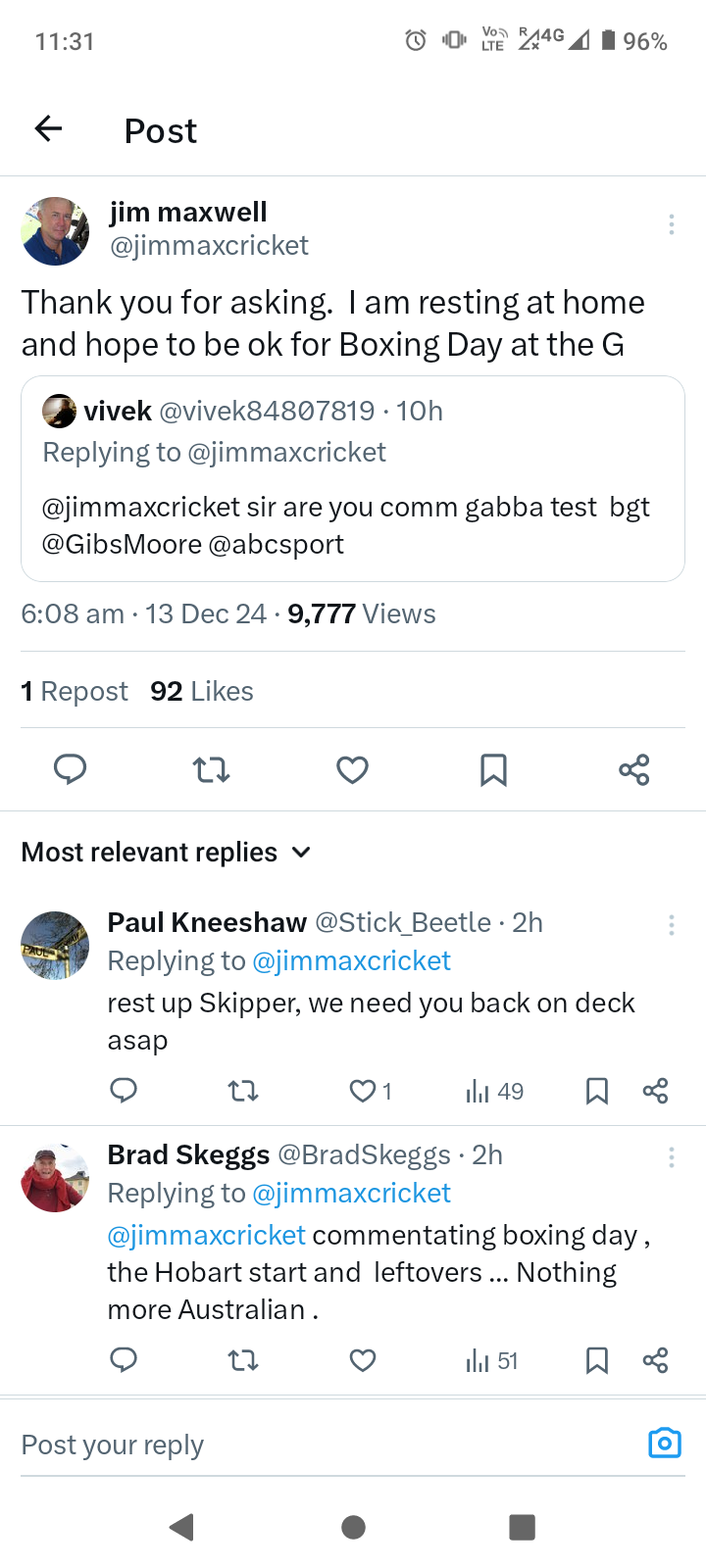 Corbin Middlemas said that Jim Maxwell is sick and won’t call today’s play for ABC Radio, but should recover in time for the third test in Brisbane later this week.