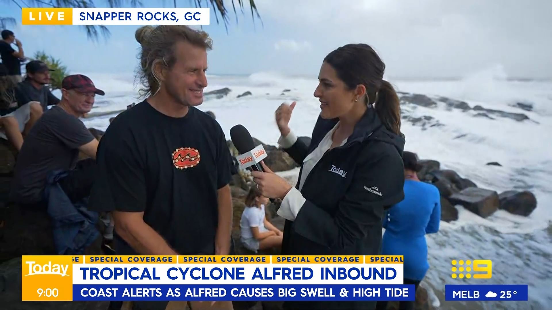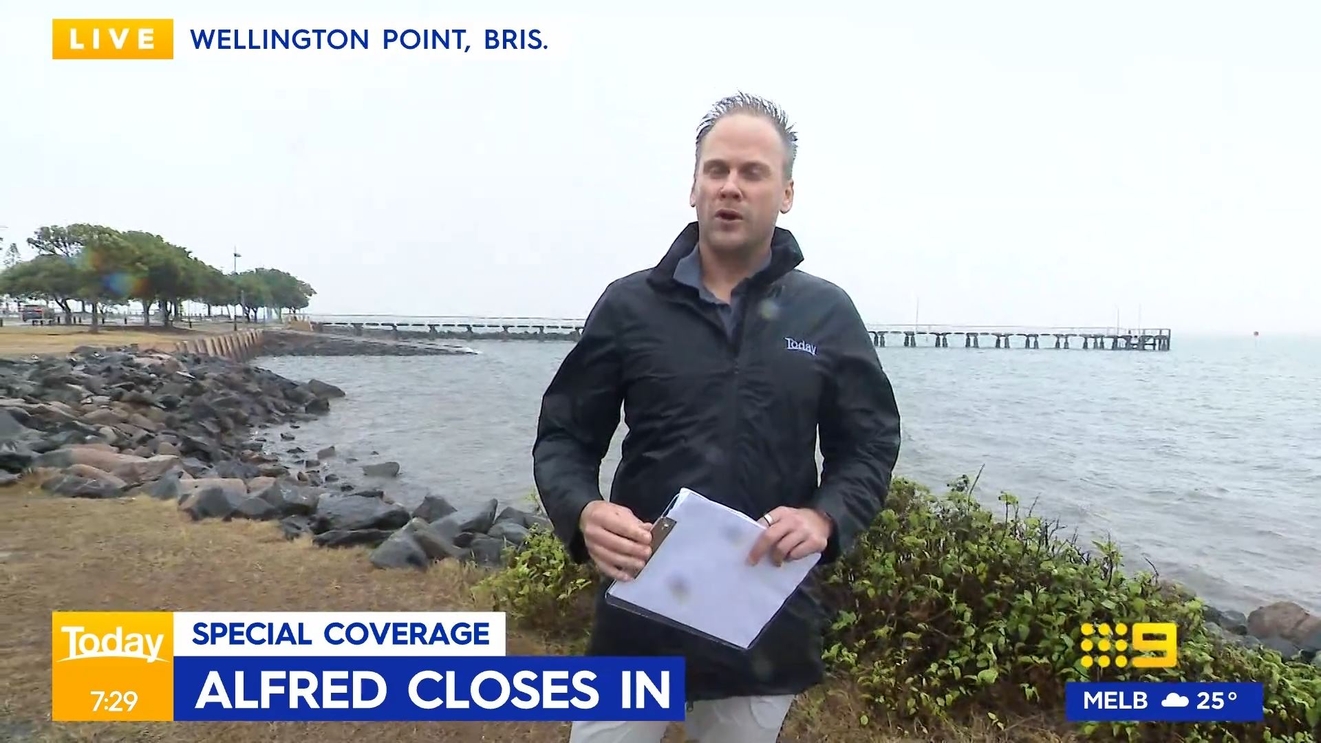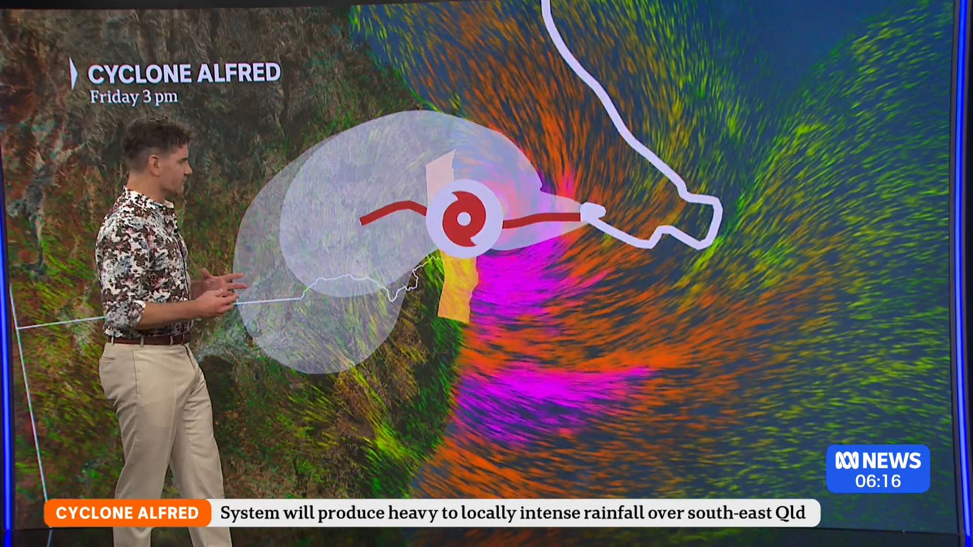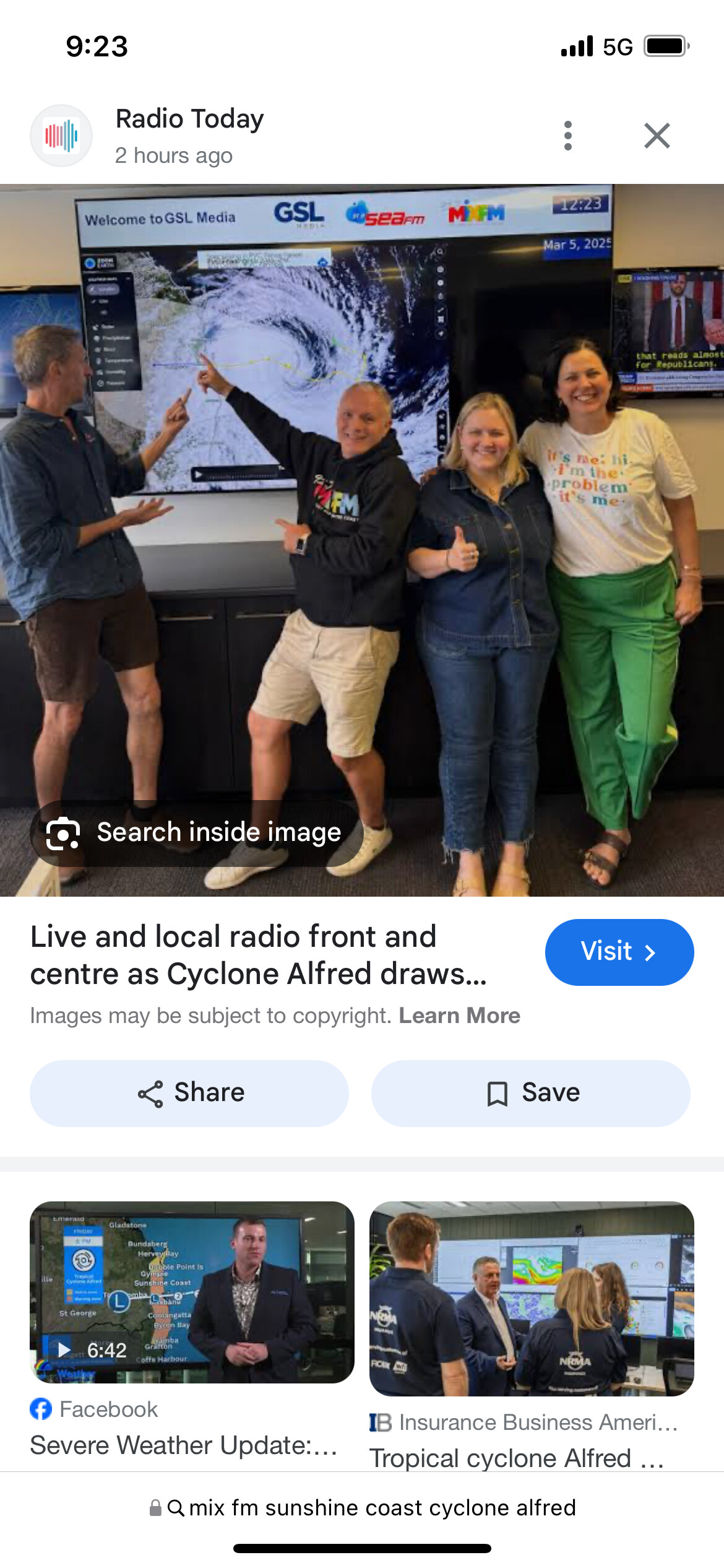 The Mix FM show on the Sunshine Coast did what all brainless FM breakfast shows would do. They posed with smiles, laughs and thumbs up in front of a satellite image of Alfred. Destructive winds. Property damage, injuries, flooding and maybe deaths will be associated with this cyclone. There is something desperately wrong with FM radio in this country.