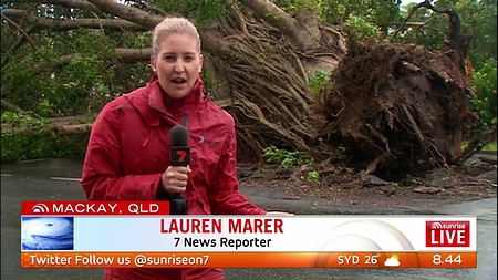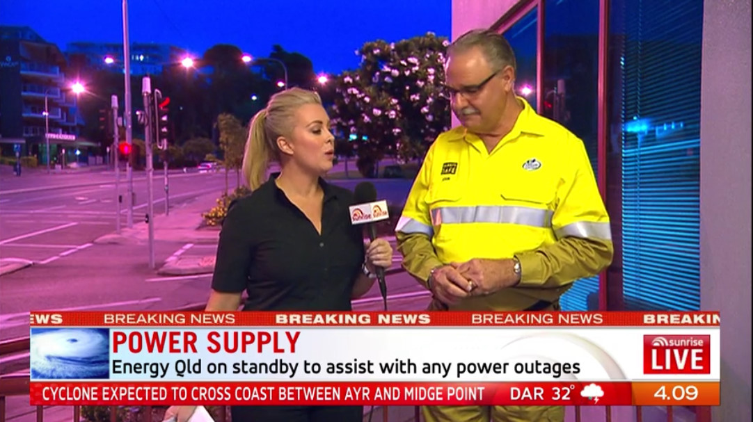 Sunrise has Sam in Townsville, Kochie and Edwina in Bowen and Sam Mac in Airlie Beach. Coastal reporter Paul Burt, Katrina Blowers and Chris Reason are in Bowen, Bianca Stone is in Mackay, Leisa Goddard is at Emergency HQ in Brisbane and Tony Auden is doing crosses from the Brisbane news studio.