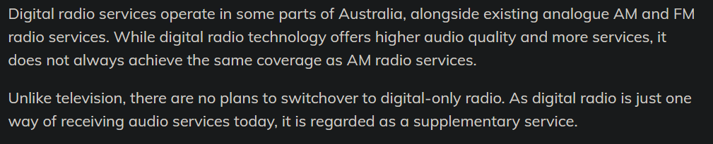 Why not lean into this element of it and not the “more”, is what I’m saying? Let’s just admit that was bad marketing. It’s not like it’s this wildly popular service at the moment. We’ve just been talking about how stagnant it is and most people don’t even understand what it is. Every DAB+ radio has an FM option and people are using FM anyway, which sounds better. Someone in the other thread also reported that their parents were saying “Can you fix our radio, Gold 104 sounds bad” because they didn’t understand what DAB+ was and immediately recognised that it sounded worse. That says a lot to me. Like let’s just live in reality with that and also free up the bandwidth.