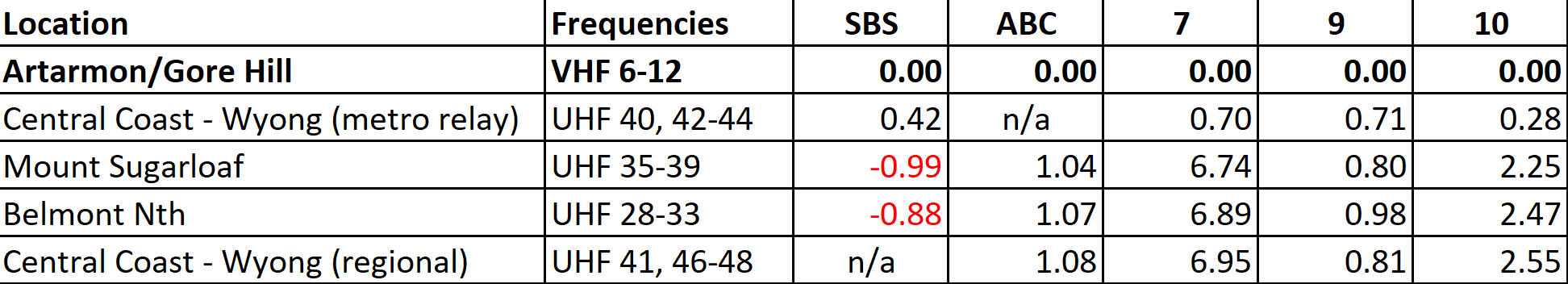 Channel 7 has the biggest delays from Sydney to Newcastle/Central Coast regionals (nearly 7 seconds Artarmon), whilst SBS regionals are actually slightly ahead of Sydney (thus they show as a minus).
