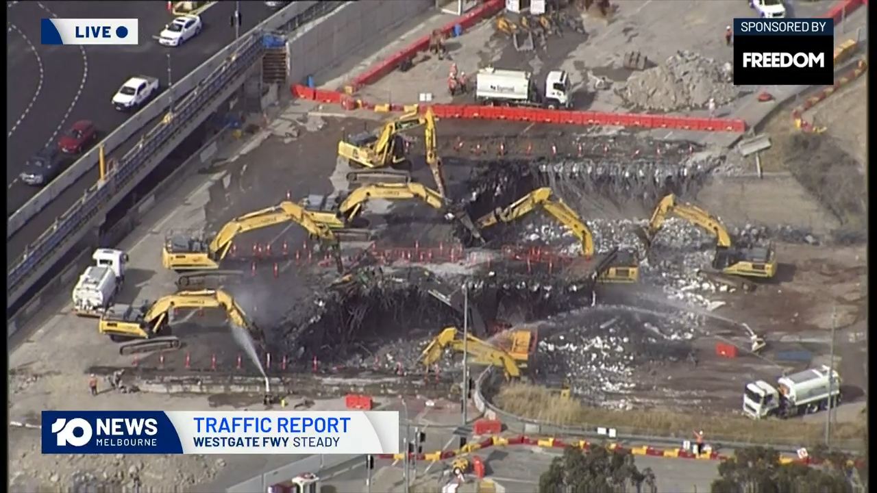 About 5km of the Calder Freeway in Ravenswood South has been burnt by the grass fire that ripped through late yesterday and sparked an emergency. 1 person was found dead, though not directly related apparently and reports of several buildings/structures being lost in Harcourt, as well as the broadcast transmission tower.