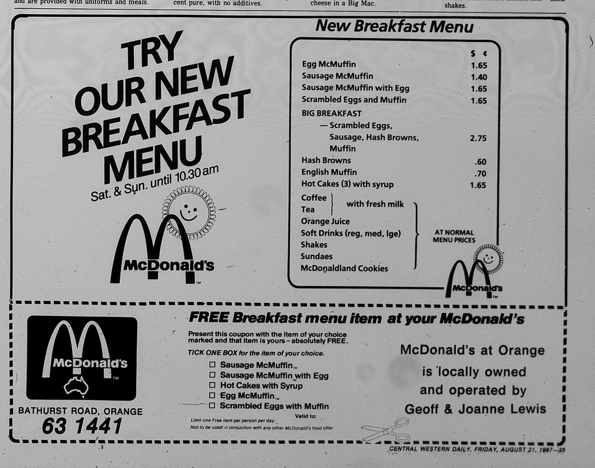 This might/might not be of interest to anyone, but found this original McDonalds breakfast menu from when it was first launched in Australia in 1987.