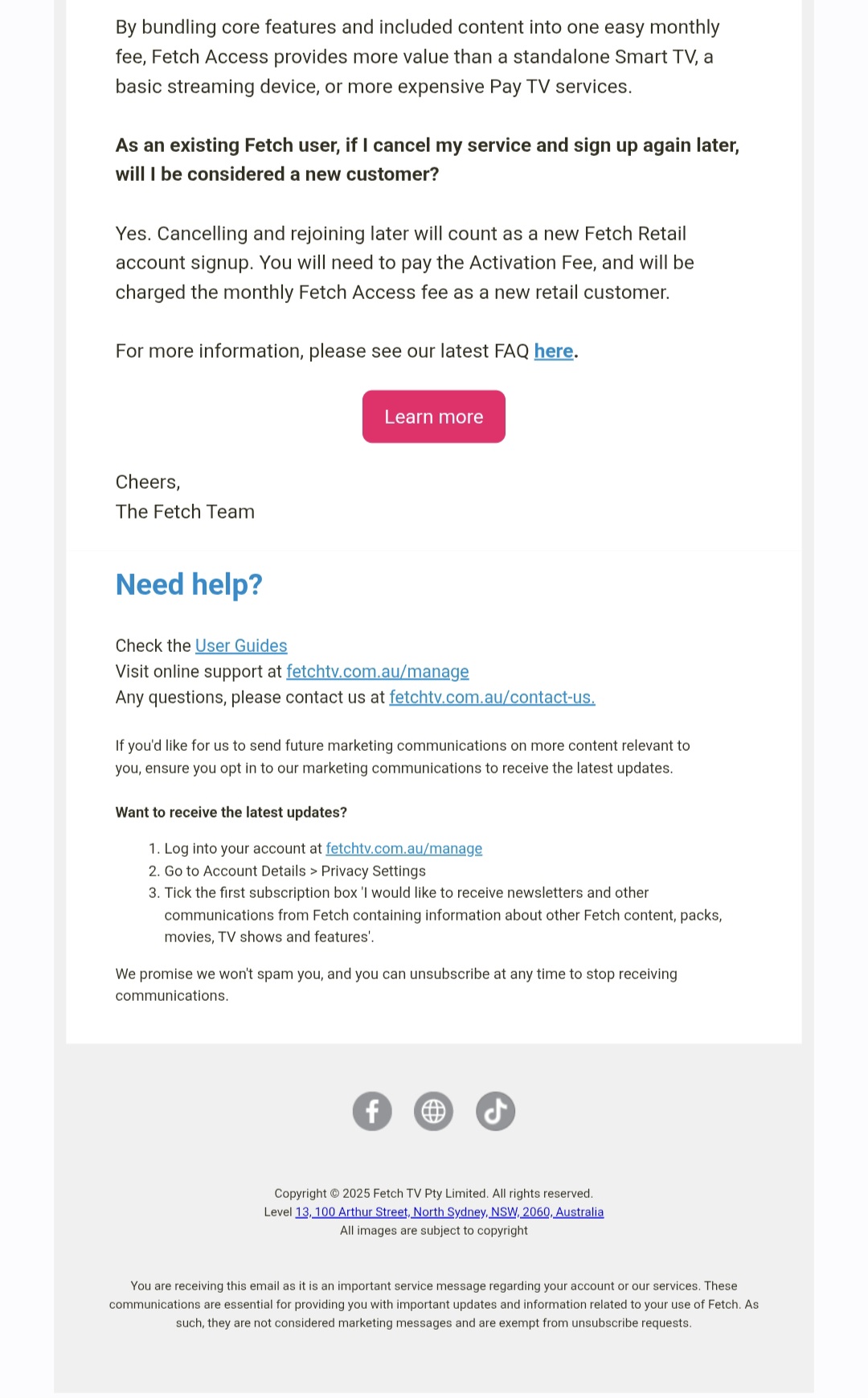 New Customers who activate an account on and from 1 December 2025 new customers will need to pay the Fetch Access Monthly Fee to to use Fetch. Fetch will not charge you for the Fetch Access Monthly Fee until 1 February 2026.