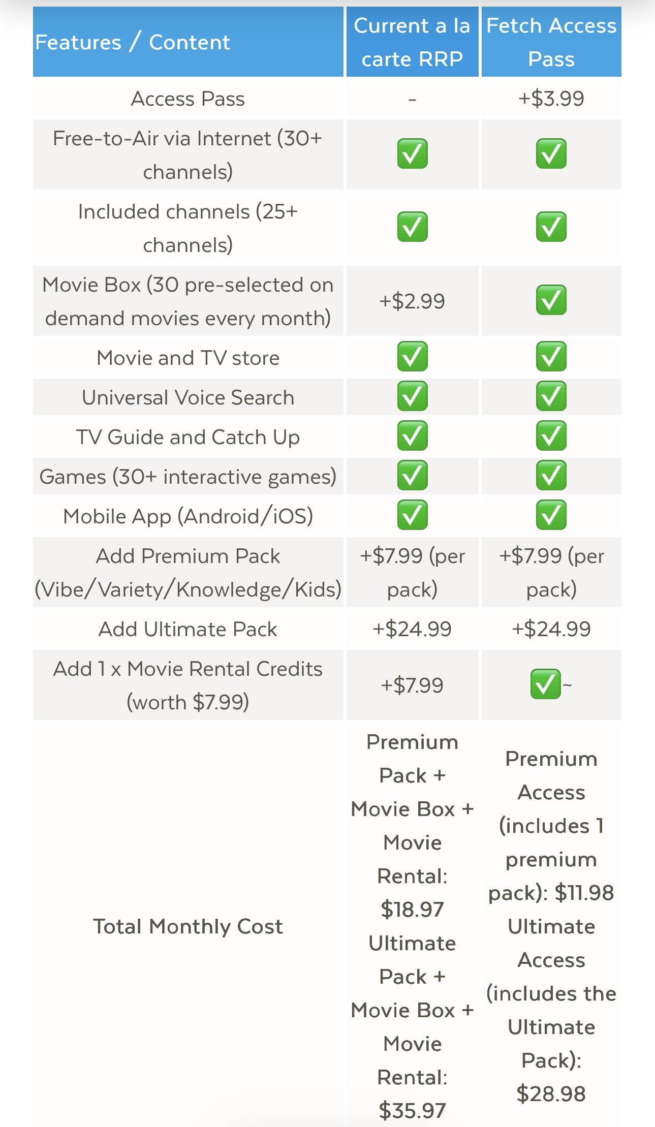 When you pay the Fetch Access Monthly Fee you get: access to the TV Guide and universal search, 30 family friendly online games, plus other content including live and on-demand TV channels, and Movie Box with 30 on-demand movies each month and access to supported streaming apps (cost of subscriptions not included).