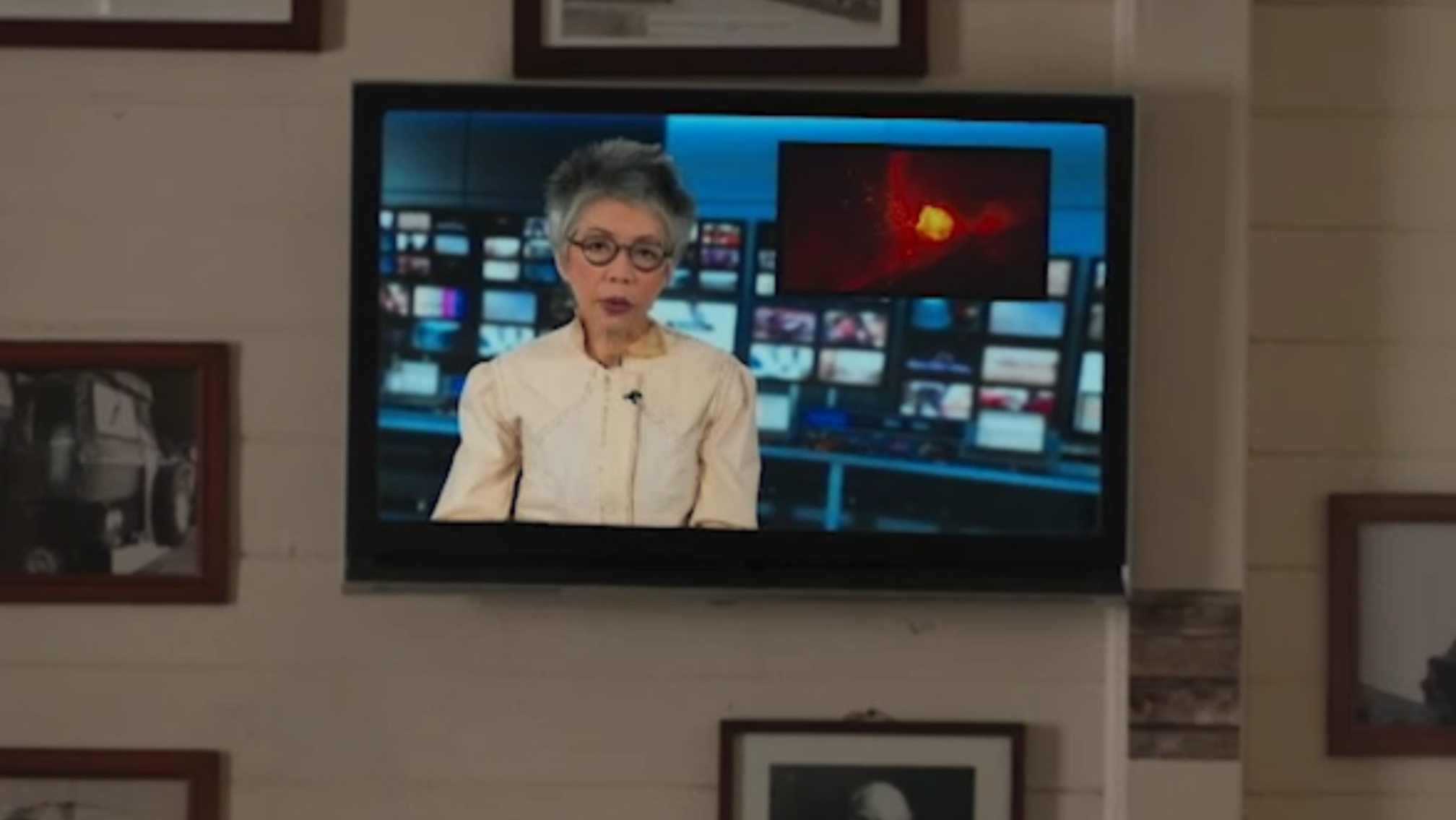 While the camera moves around the deserted spaces, a collage of audio clips that sound like on air anchor reads play in the background.