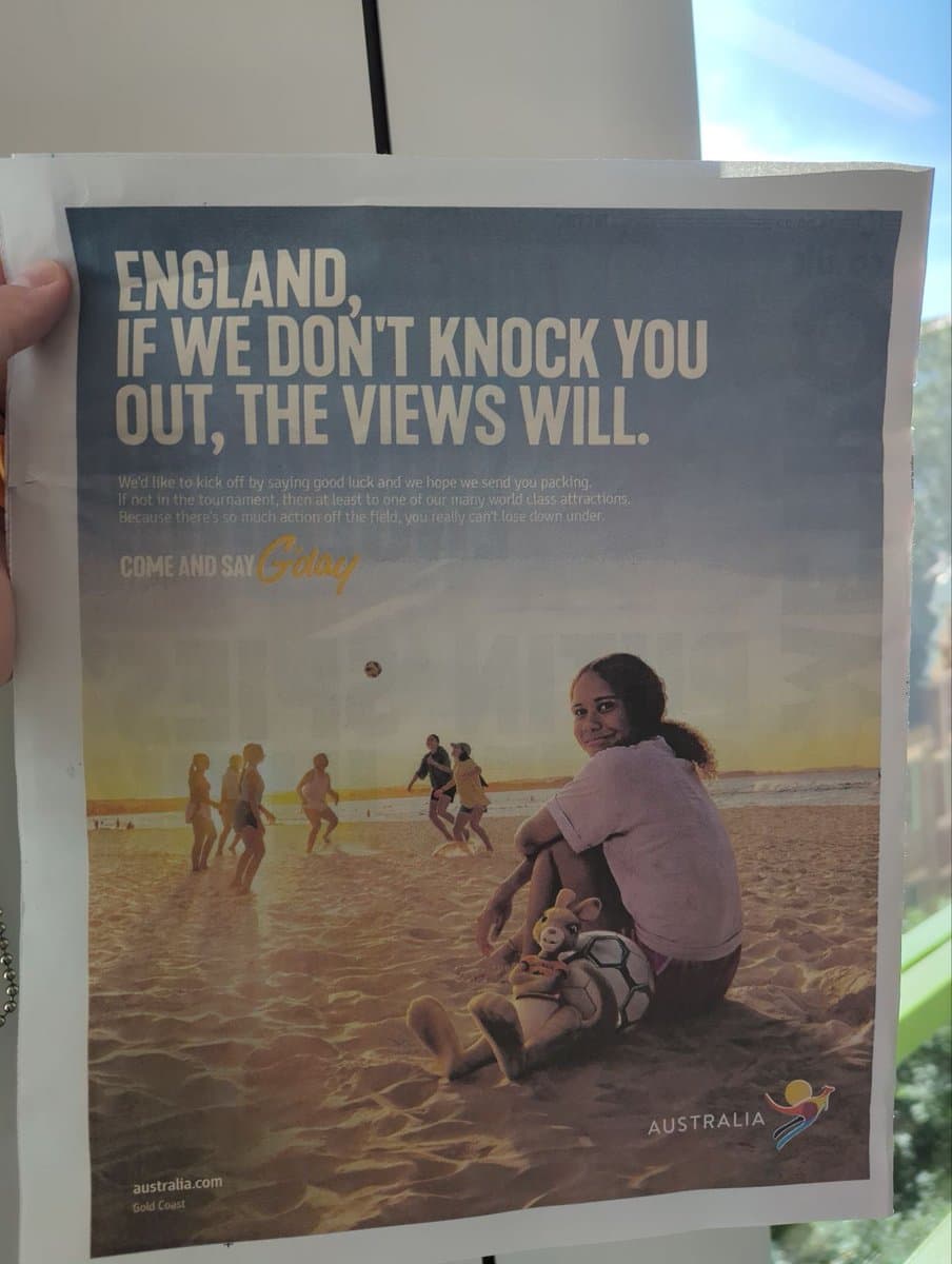 Amazing add from @Australia in UK papers today, sledging the poms and simultaneously asking them to take the 22hour trip over #Matildas #FIFAWWC pic.twitter.com/PuyfS8VYTk