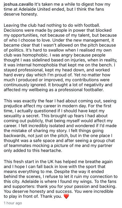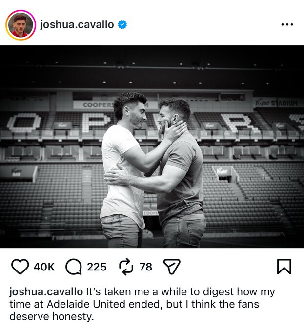Josh Cavallo has branded Adelaide United homophobic in an Instagram post.