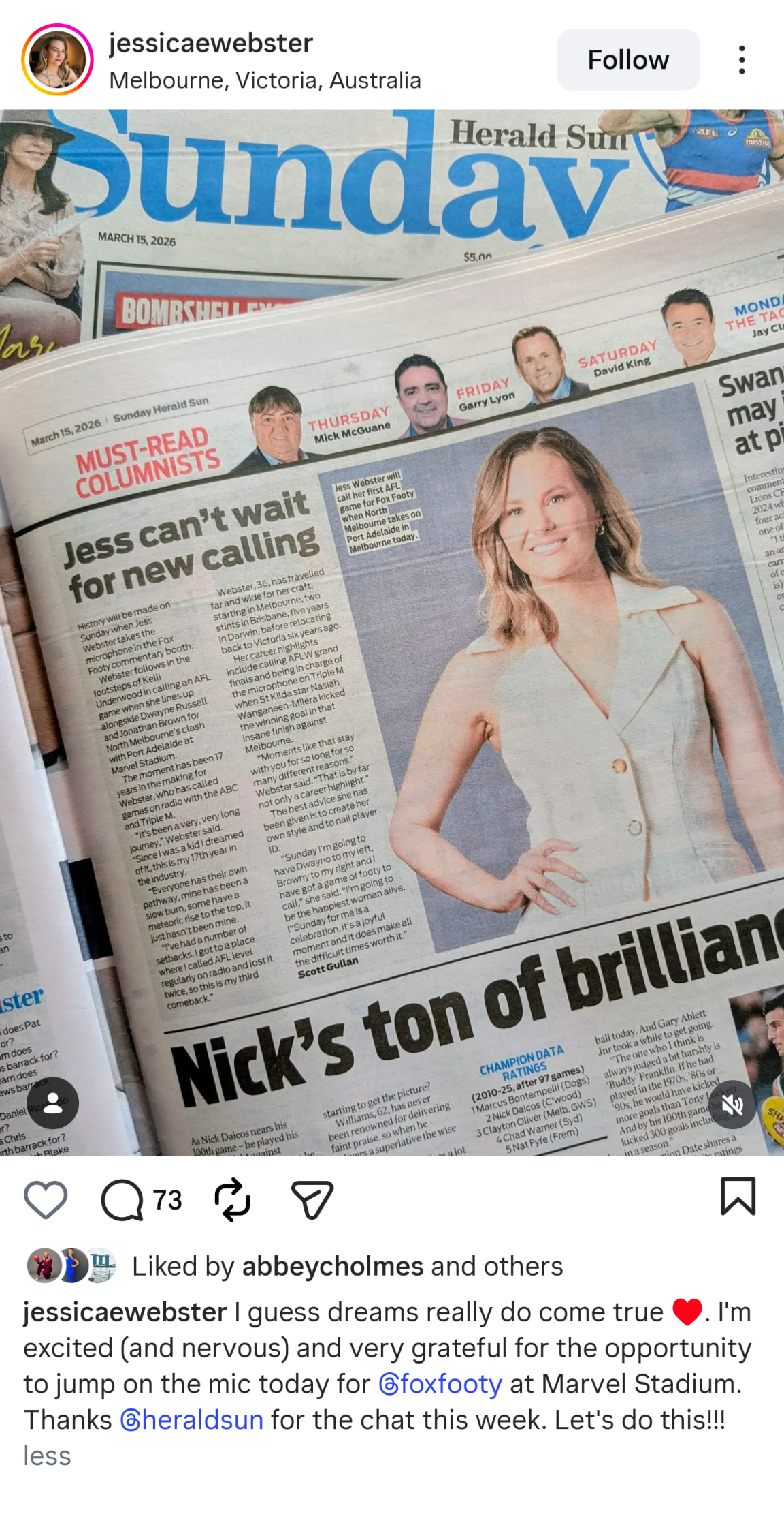 Jess is fantastic on radio. Her call of the Saints win was just as good as Jason Bennett on 7afl. So it’s fantastic that she’s going to be calling games for Fox