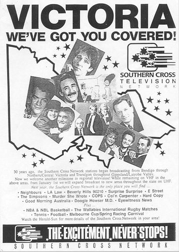 and Southern Cross had quite a few problems with its UHF-46 transmitter at Mount Major in the first few years of aggregation, often the signal cut mid-programme and not returning for several hours after, which meant after January 1 at times Goulburn Valley viewers still had the choice of just ABC and Vic TV. Not that it mattered to most Shepparton viewers who after being fed up with the unreliability of UHF-46 that they continued to watch Southern Cross via BCV 8 Bendigo (and continued to do so until analogue switch off a few years ago). And the quality of the picture on UHF-46 was not good either, when there was yellow on the screen you would see waves across it (particularly with the heads on the Simpsons). This problem was cured when SC commenced digital transmission in the Goulburn Valley in 2005.