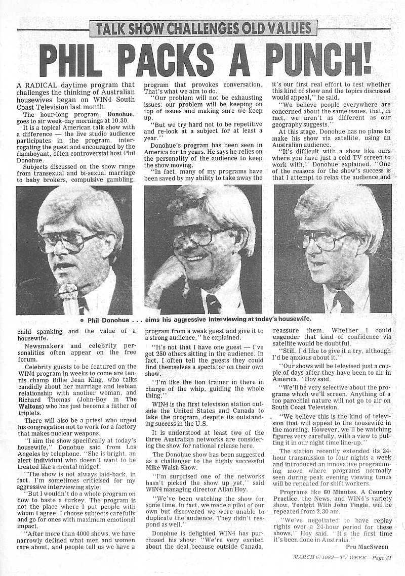 FIrst, in 1982, when WIN4 became the first TV station outside of US-Canada to pick up the Donahue program. It was eventually picked up by the Seven Network and then later Network Ten.