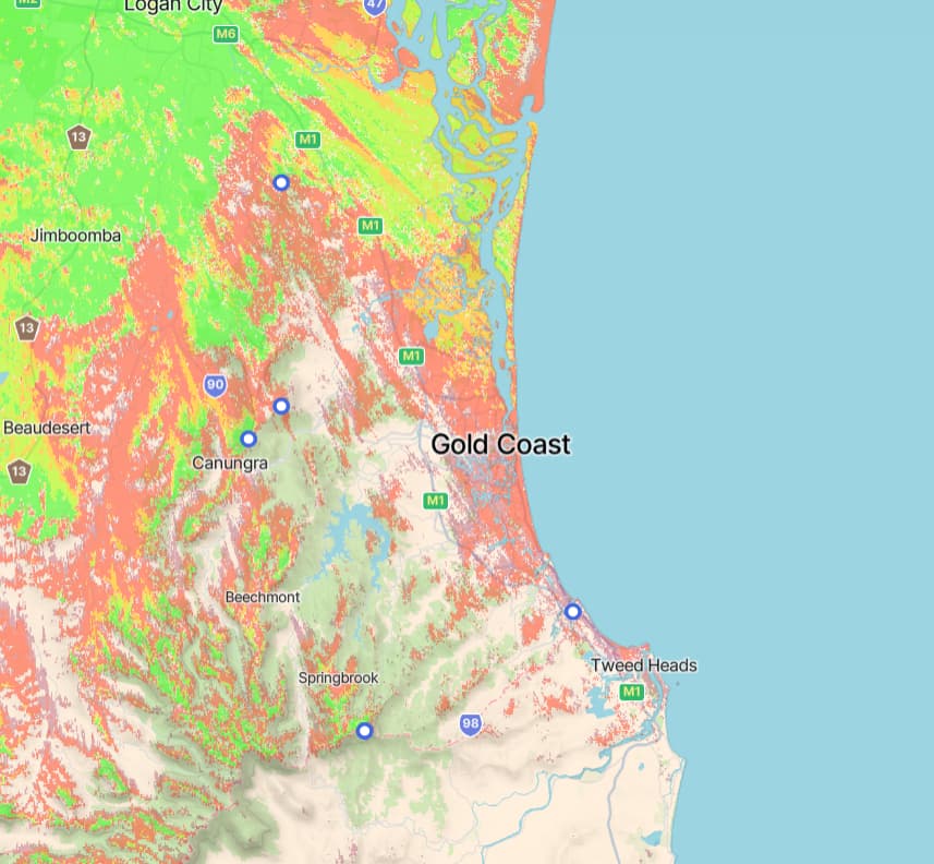 The Mount Coot-tha signals are fully shadowed south of GC proper.