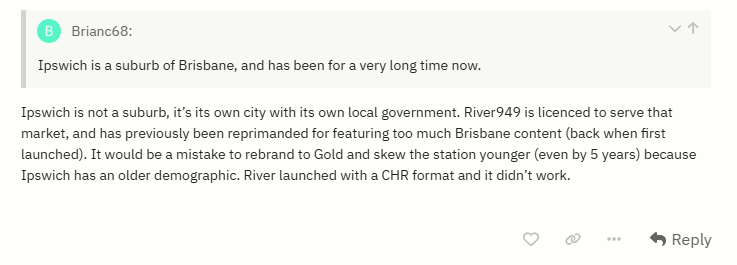 Ipswich is not a suburb, it’s its own city with its own local government. River949 is licenced to serve that market, and has previously been reprimanded for featuring too much Brisbane content (back when first launched). It would be a mistake to rebrand to Gold and skew the station younger (even by 5 years) because Ipswich has an older demographic. River launched with a CHR format and it didn’t work.