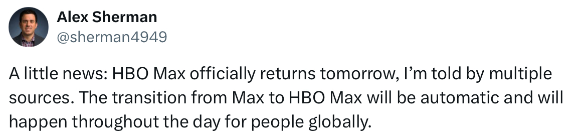 CNBCâs Alex Sherman is being told the HBO Max re-rebrand will happen globally over the course of the next day.