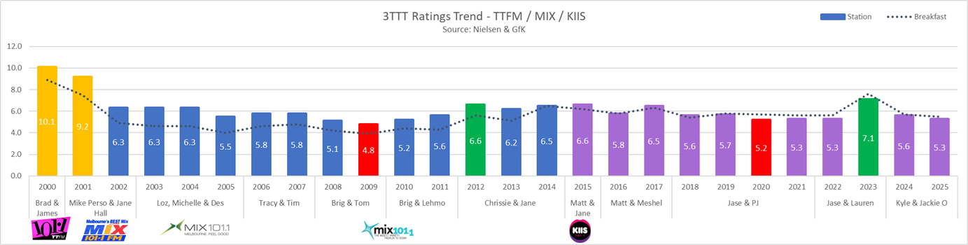 That’s a fair call about KIIS being more succesful than Mix. The replacing of Jase & Lauren with Kyle & Jackie O co-incides (or should that be correlates) with a drop in KIIS ratings back to Mix levels, creating some recency bias. It also should be noted that the low ratings of 2020 were COVID impacted with a reduction for most music stations in favour of talk stations.