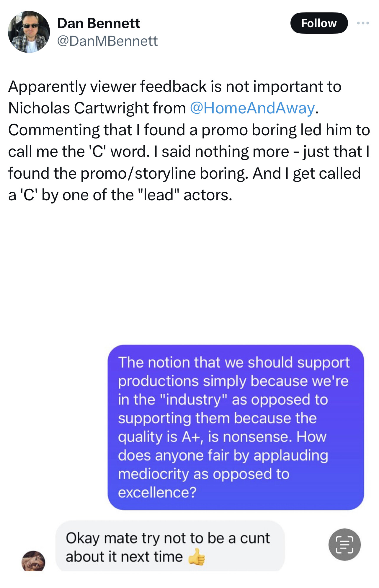 Well, yeah, that is another angle. It’s a bit disappointing from Dan really. He’s in the industry. Why shit on one of the very few Australian dramas in production? It didn’t warrant that reply from Nick of course but I can understand Nick’s frustration at the post.