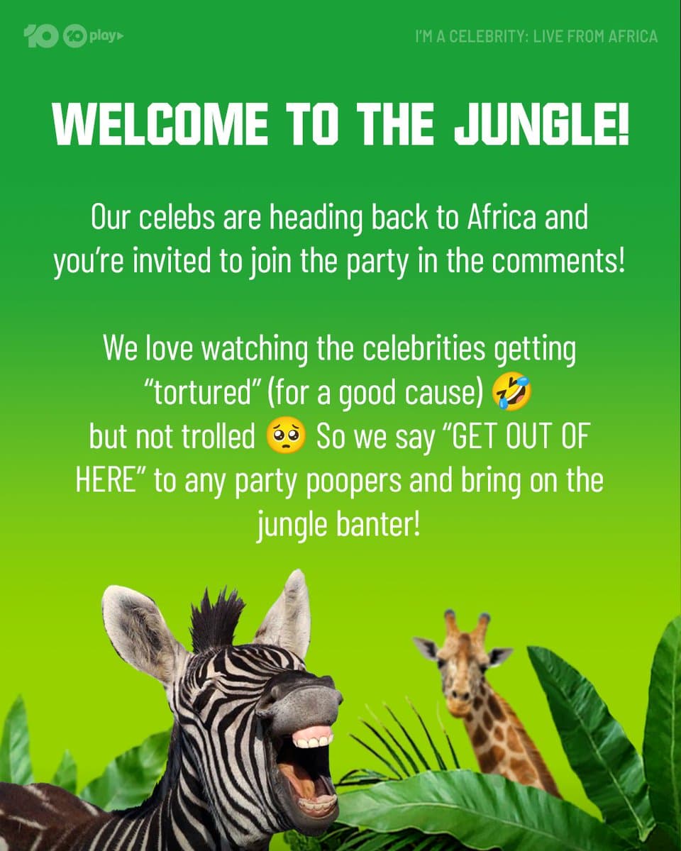 We all love a bit of friendly banter in the comments, but we ask that you please keep your manners and not turn into wild animals 💚🦓🦒#ImACelebrityAU Starts 7.30 Tonight on @Channel10AU and 10 Play. pic.twitter.com/scNwotOBO3