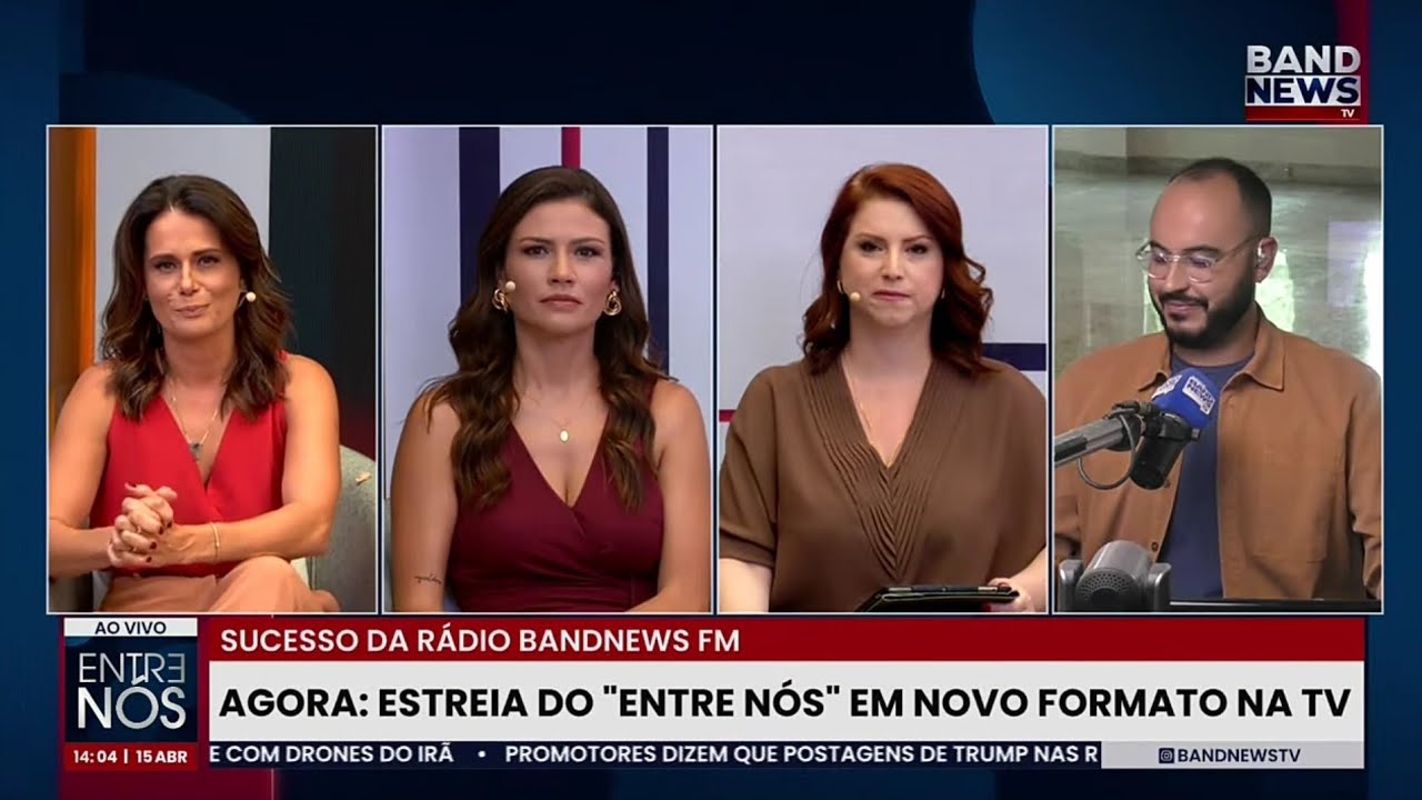 Band TV’s subscription news channel is now BandNews TV, whose brand more closely resembles their sister radio network. This is the new channel vinheta and the opening of Entre Nós, a BandNews FM show redesigned to simulcast onto TV: