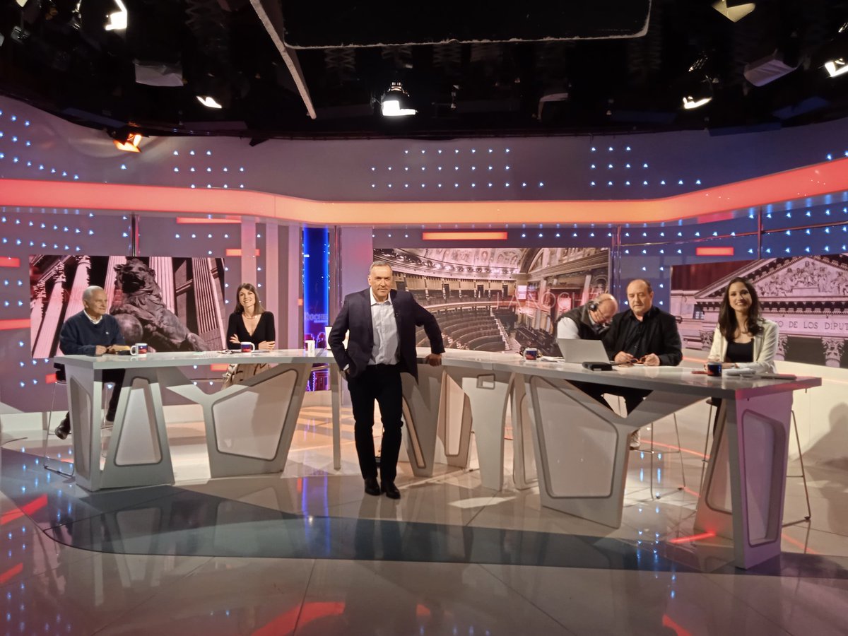 The new set design is clearly designed to be in the line of the Telediario set, which has been designed for augmented reality and immersive mixed reality. The new set goes in that line, but it has been designed to house the channel’s needs, with a smaller video wall and special set elements for debate and analysis programming. The new studio launched during its main debate show La Noche en 24 Horas; the channel’s programming also saw the arrival of new opening titles, stings and theme music in the style of the current Telediario branding; they already use supers very much in line with theirs.