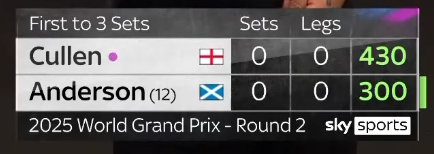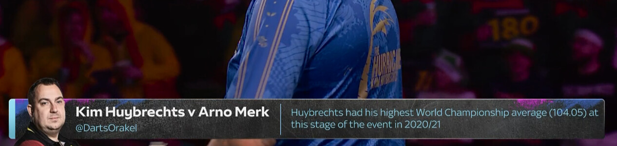 Slightly updated graphics from Sky Sports for the 2026 World Darts Championship, mainly fonts and sizing but a new graphic added for a set win. The score graphic is now slightly smaller, and has received rounded edges with the sets/legs/score columns more condensed.