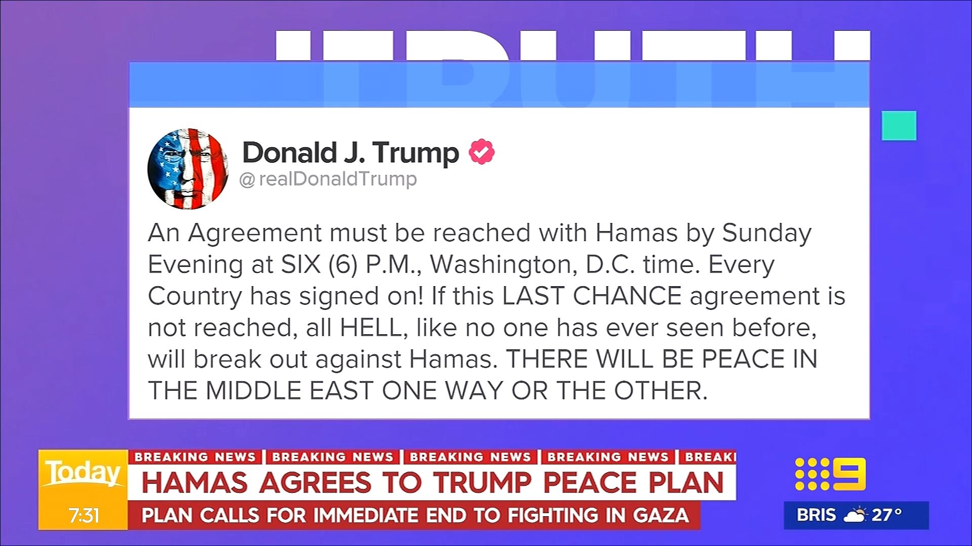 A source tells Sky UK a full ceasefire deal will be announced some time between 7am and 7pm AEDT tomorrow.