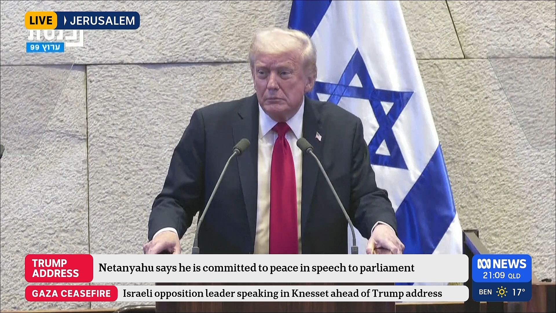 Confusing straps. Trump clearly at the lectern, yet the higher strap references Netanyahu speaking, while the lower one says the opposition leader is speaking ahead of Trump.