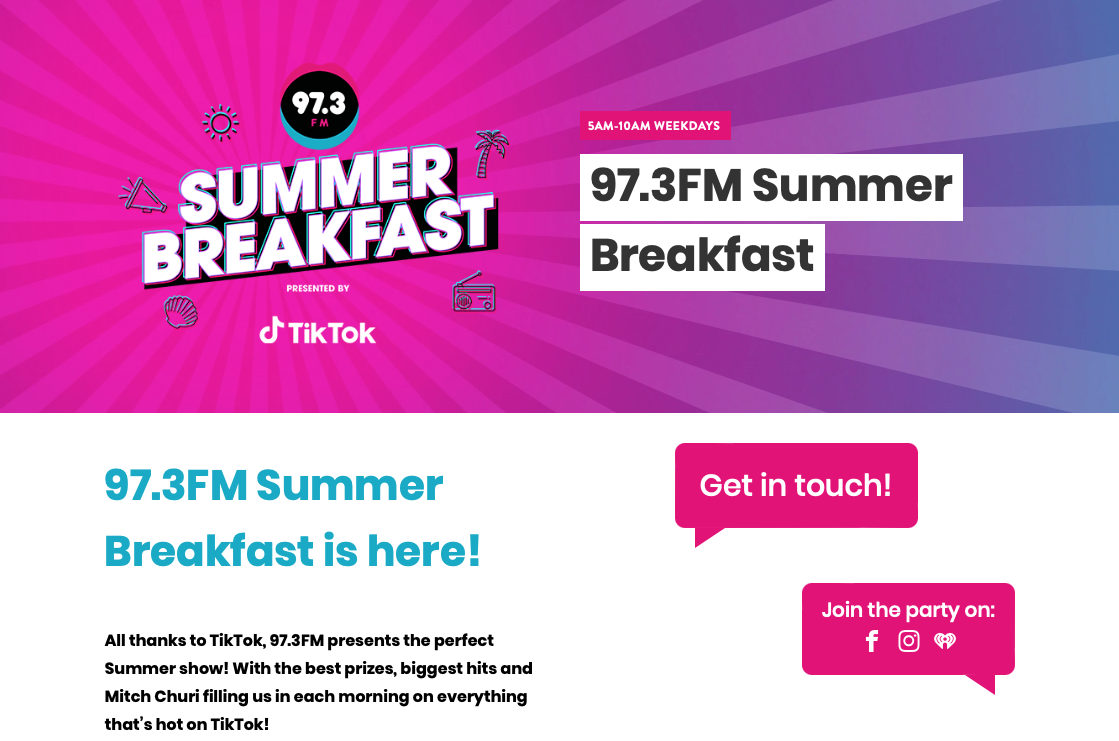 âAll thanks to TikTok, 97.3FM presents the perfect Summer show! With the best prizes, biggest hits and Mitch Churi filling us in each morning on everything thatâs hot on TikTok!â