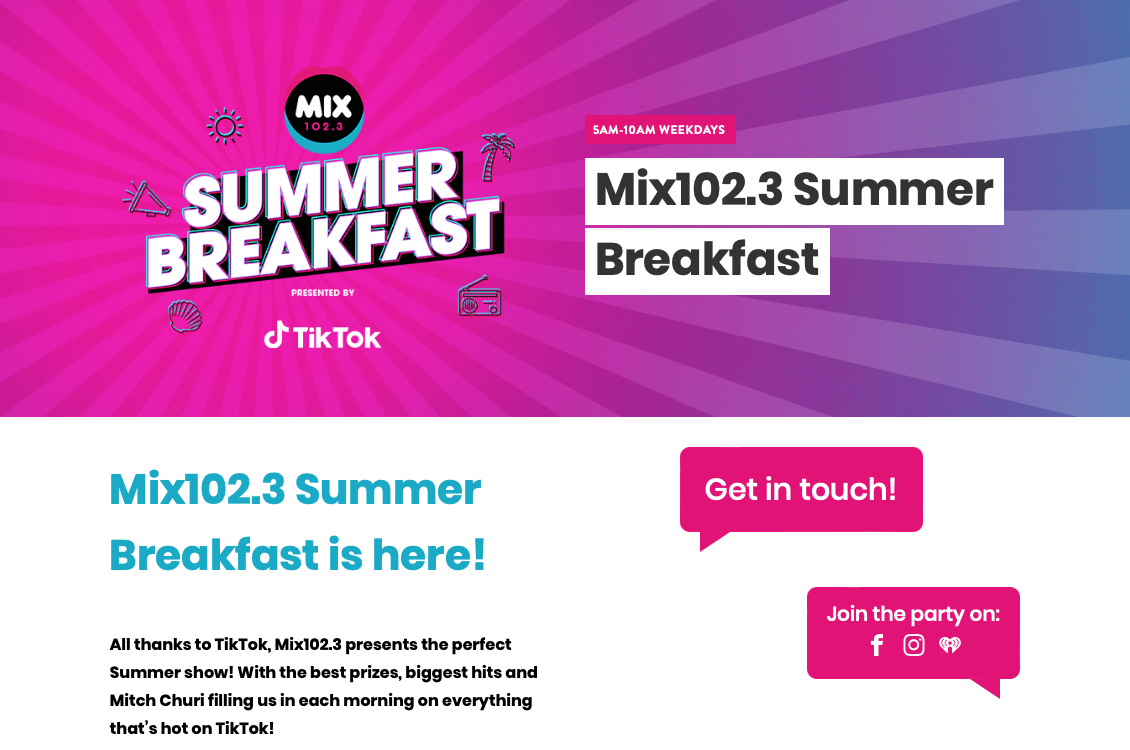 So listening the last couple of days it sounds like a national Summer Breakfast sponsorship from TikTok which also happened to include Mitch doing a âwhatâs trending on TikTokâ news segment. Donât know why they couldnât have gotten their local announcers to voice these? Maybe they thought the announcers on 97.3 and Mix were too old for TikTok?