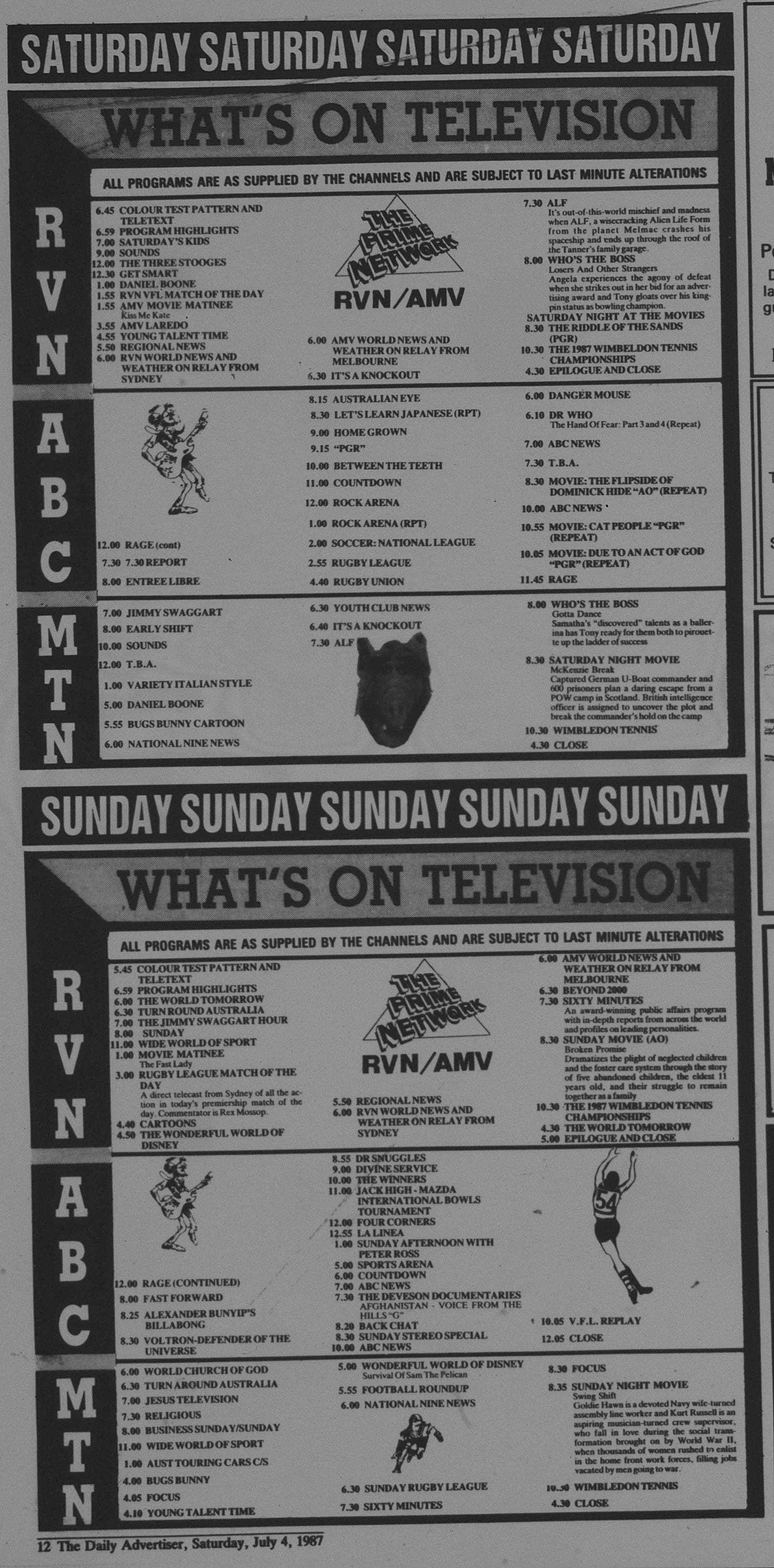 This TV Guide I found in the Wagga ‘Daily Advertiser’ for July 1987 (that listed AMV variations in addition to the local RVN programs) seems to suggest that AMV didn’t show any VFL at all on Saturdays, and seems to suggest both AMV/RVN got the Sydney rugby league live on Sundays.. Was this right?