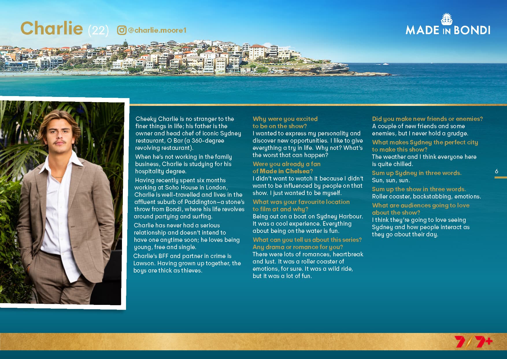 Charlie is no stranger to the finer things in life; his father is the owner and head chef of the iconic Sydney restaurant O Bar (a 360-degree revolving restaurant).