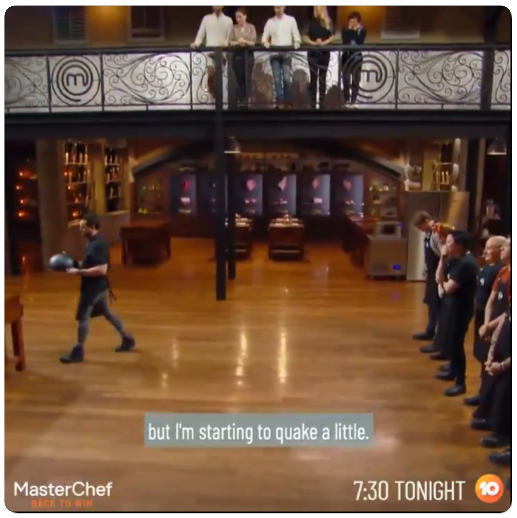 MasterChef’s Twitter account posted a two-minute sneak peek of pressure test this morning. As chef Peter Gunn brought in the black box dish, I notice there were only five contestants at the gantry, members of the dessert team which won last night’s service challenge. Since seven other contestants were cooking, which two were absent?