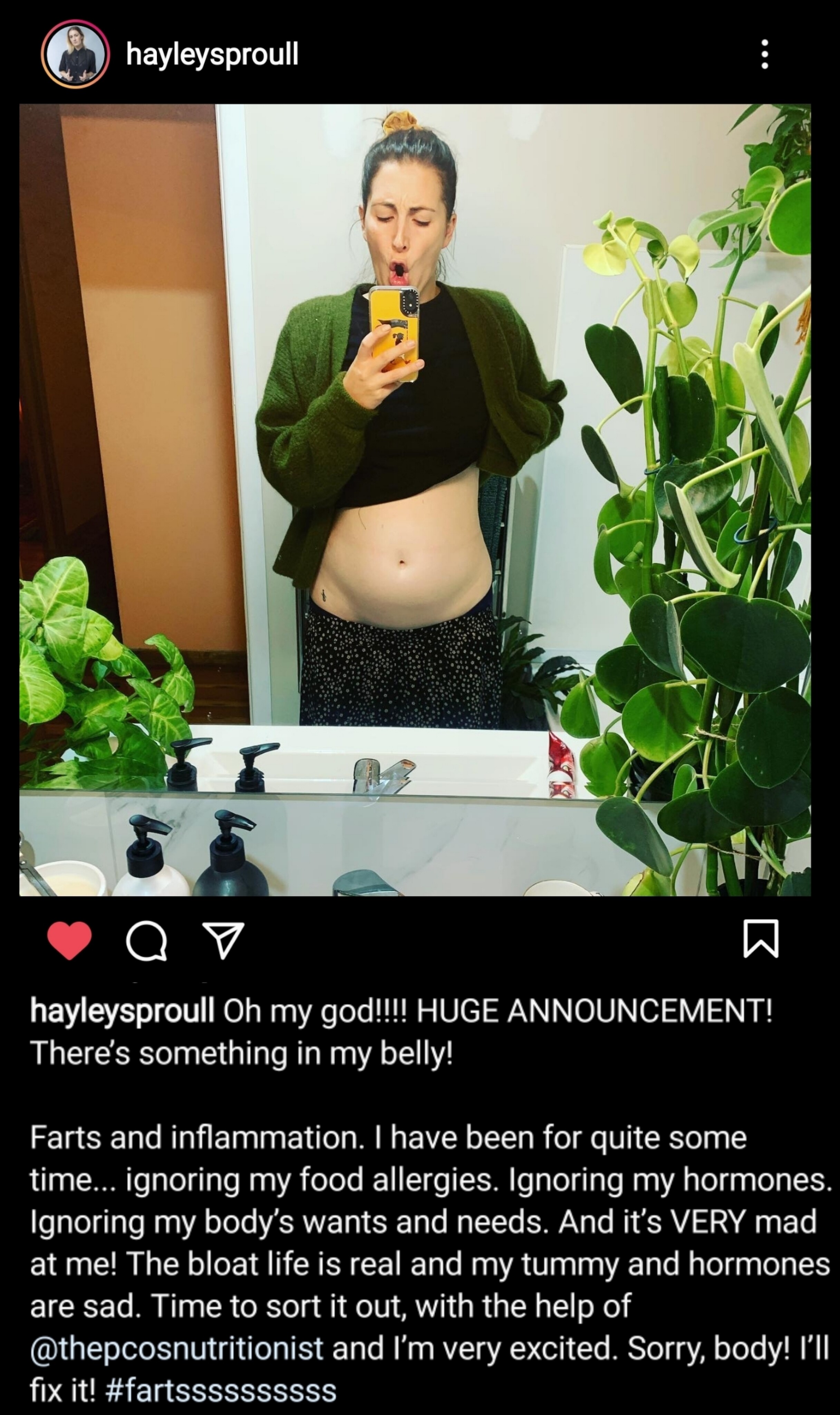 She references a condition called PCOS which appears to cause weight gain and bloating.