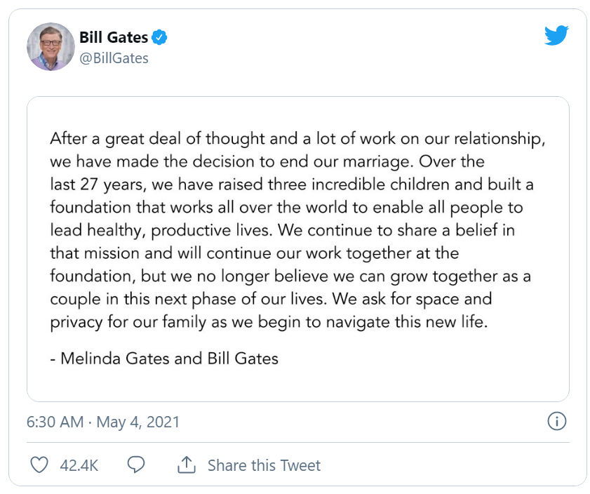 Terribly sad news. At least they will continue to work together on their foundation.