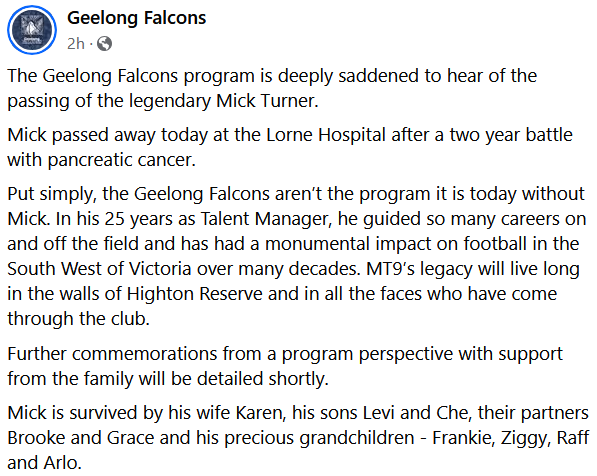 Geelong Falcons announced Turner’s passing on social media earlier tonight.