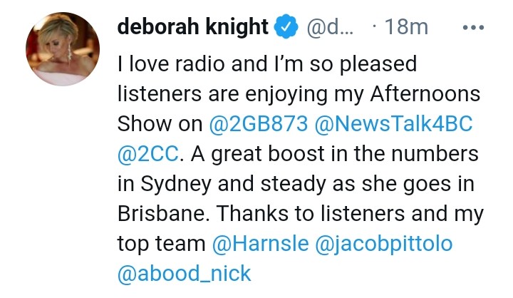 ⢠Afternoons with Deborah Knight has 6.3% (Mon-Fri 11.00am â 2.00pm).