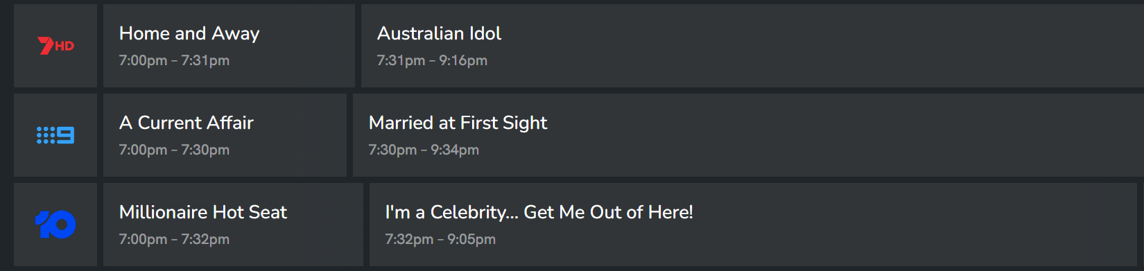 A tale of 5 cities. MAFS won the reality battle in all markets. Idol was 2nd except Melbourne where it was 3rd.