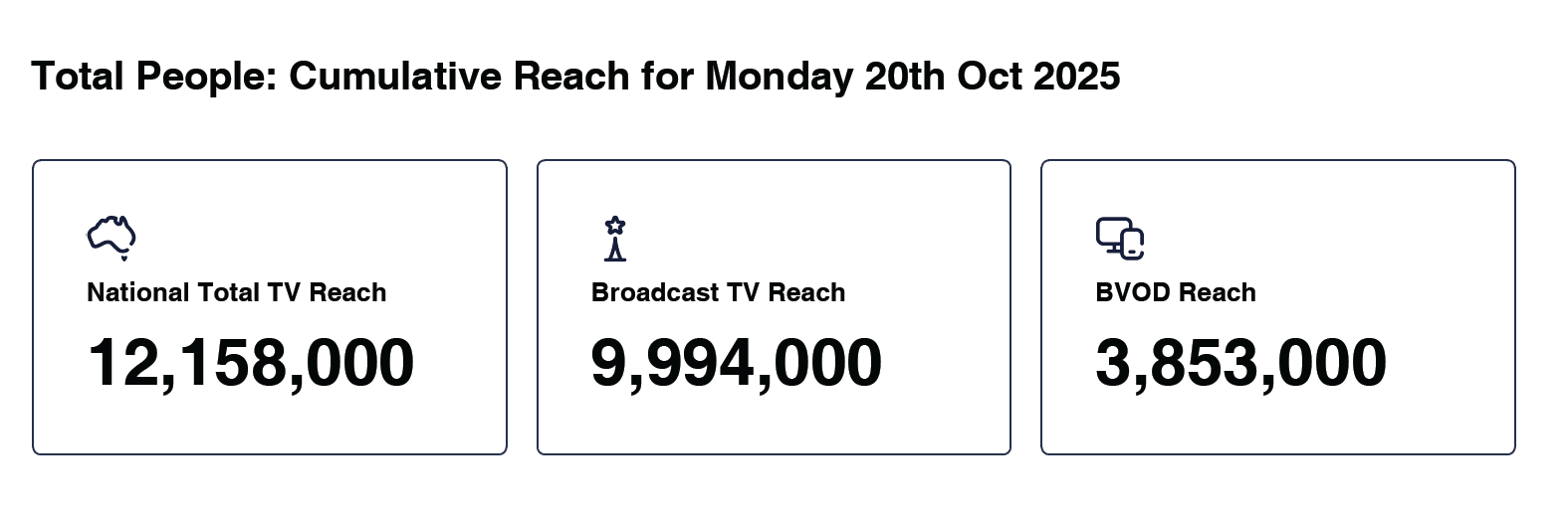 A Current Affair dominated the 7.00pm timeslot across Australia and in Sydney, Melbourne, Brisbane and Adelaide with Total People and all key demographics. It secured a National Total TV Reach of 1.758 million and a Total TV National Audience of 1.170 million up 16.7% year-on-year. On 9Now, it registered a BVOD Audience of 143,000 - up 64.4% year-on-year.