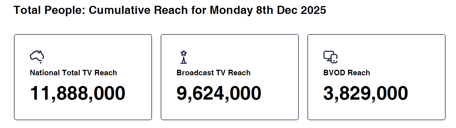 A Current Affai r dominated the 7.00pm timeslot across Australia with Total People. It achieved a National Total TV Reach of 1.549 million, a Total TV National Audience of 1.058 million (up 9.9% year-on-year) and a BVOD Audience of 122,000 (up 69.4% year-on-year).