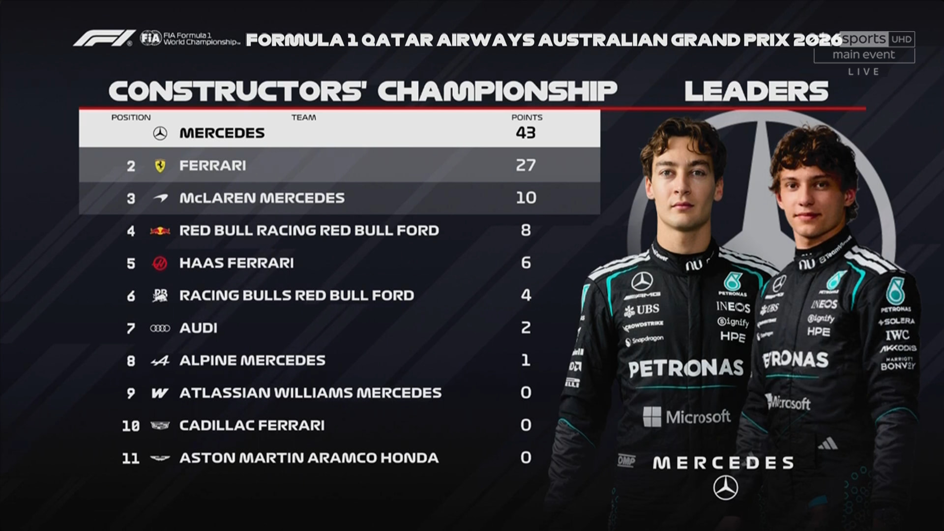 Mercedes took top two places. Great weekend for George Russell: pole position yesterday and victory today. Teammate Kimi Antonelli had his fourth podium finish.