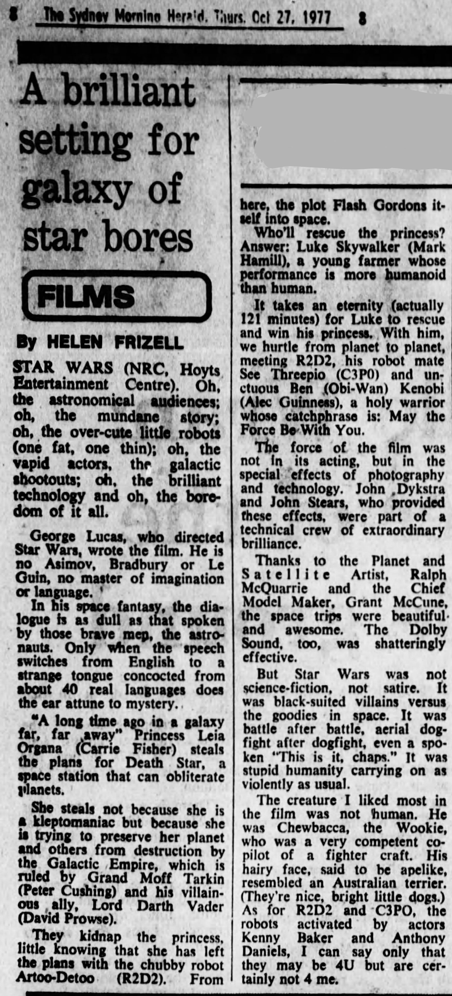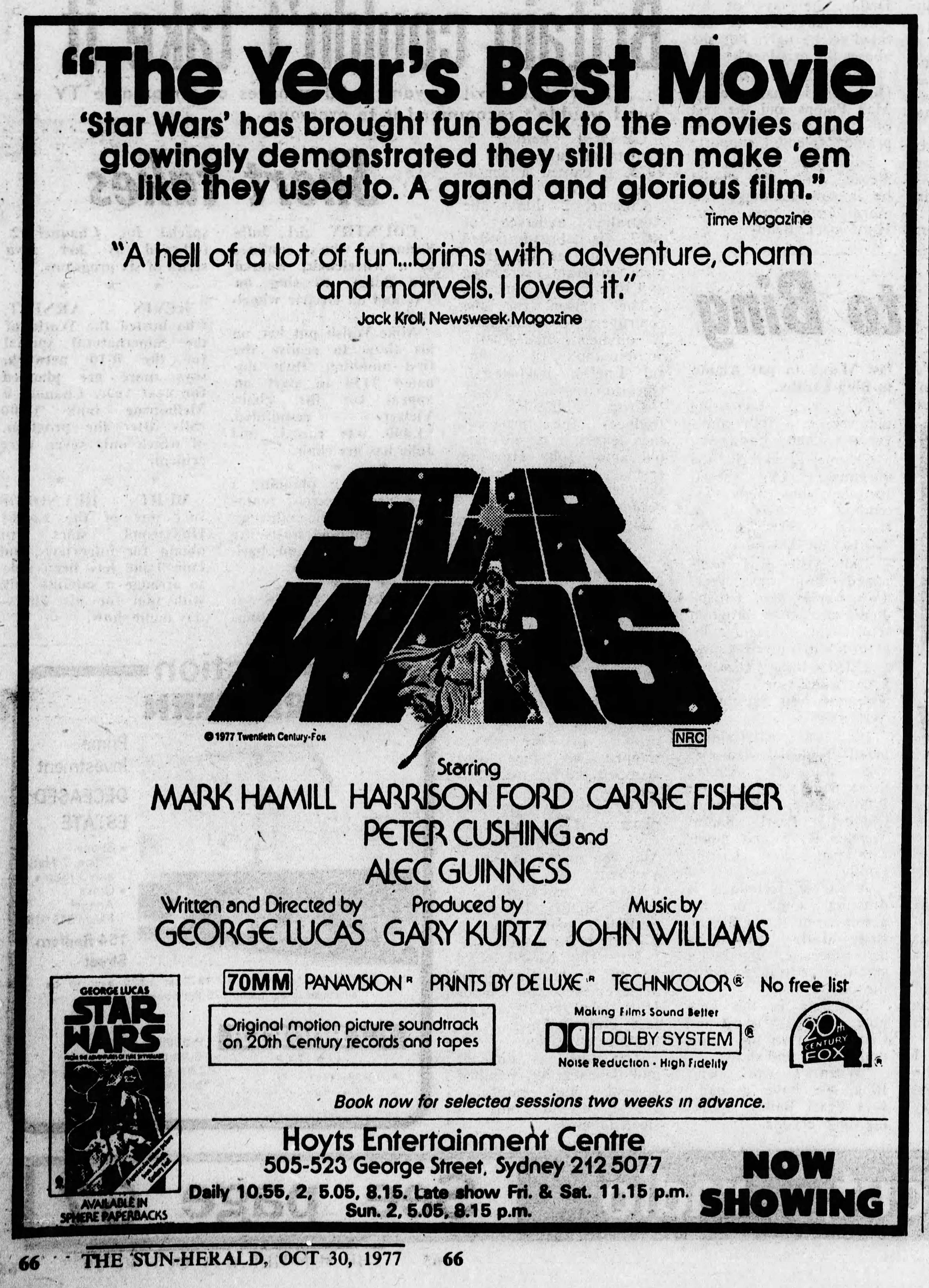 A flashback to the premiere of Star Wars in Australia on 27 October 1977 at the Hoyts Entertainment Centre in George St, Sydney. It appears that Hoyts in Sydney had Star Wars exclusively, which was probably because 20th Century Fox owned Hoyts. The Sydney Morning Herald critic hated the movie!