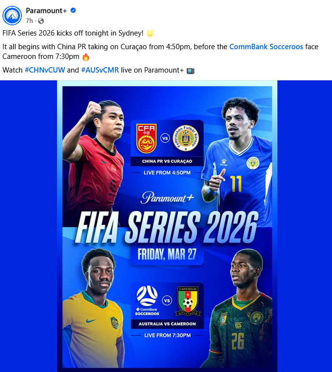 The CommBank Socceroos return to Accor Stadium tonight to face Cameroon in the opening match of the FIFA Series, with Network 10 and Paramount+ bringing Australiaâs final home series ahead of the FIFA World Cup 2026⢠to audiences across the country.