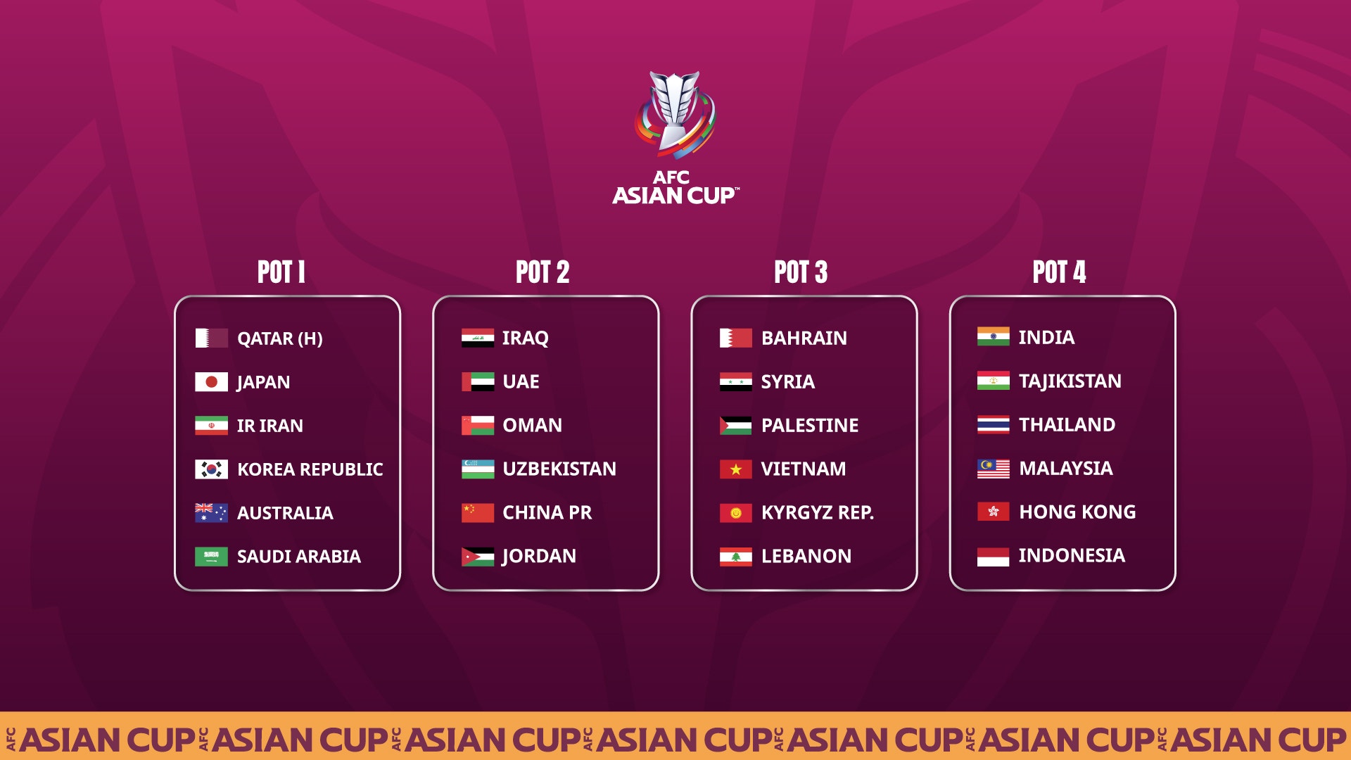 Graham Arnold’s side have been placed in Pot 1 alongside hosts Qatar and the four other top ranked Asian teams which include: four-time winners Japan, three-time champions the Islamic Republic of Iran, two-time winners Korea Republic and Saudi Arabia.