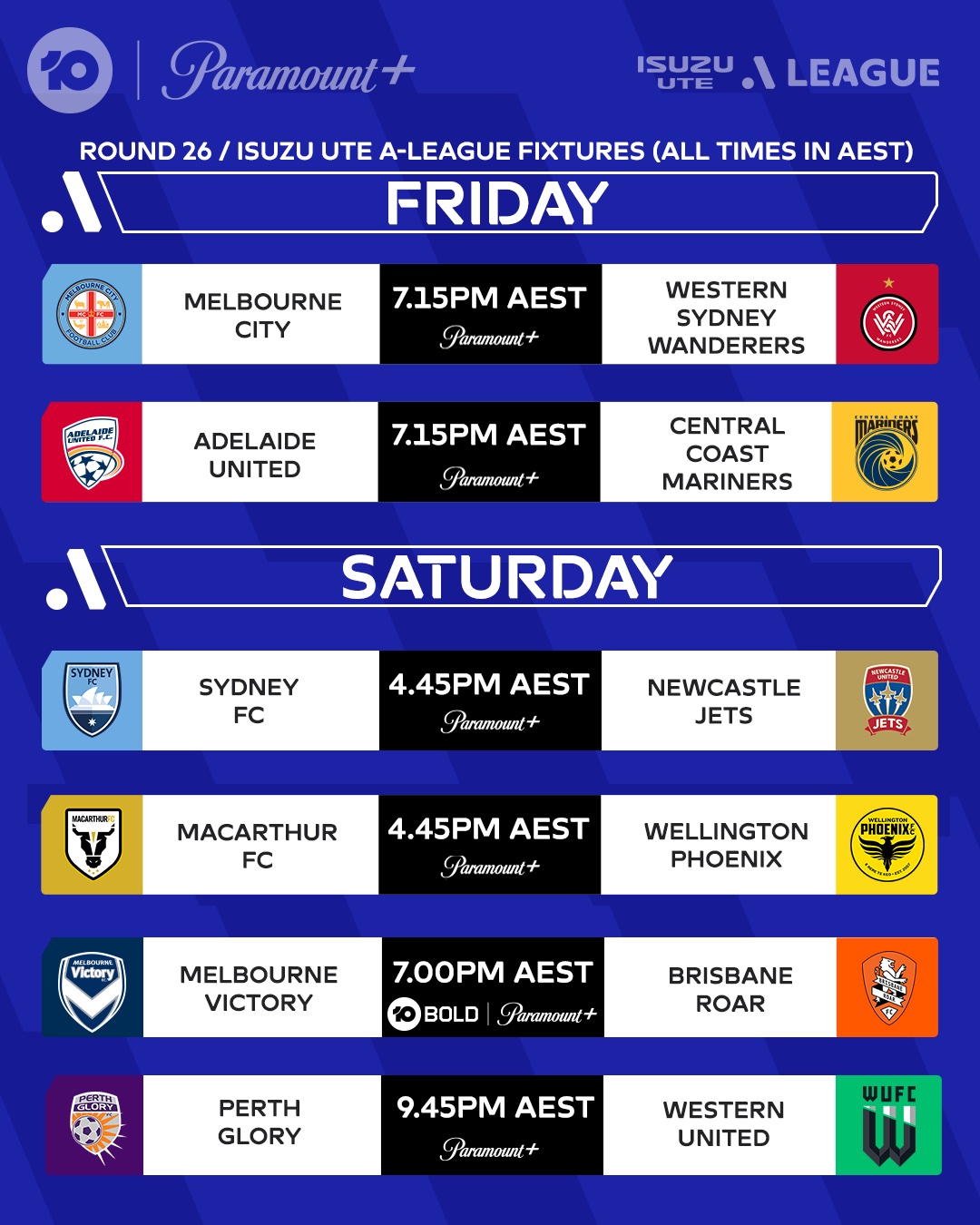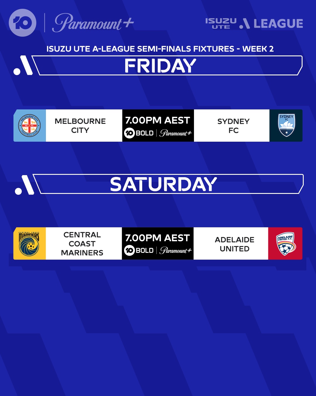 Then on Saturday night, Central Coast Mariners will host Adelaide United in their second leg Semi, live from 7.00pm AEST on 10 Bold, 10 Play and Paramount+.