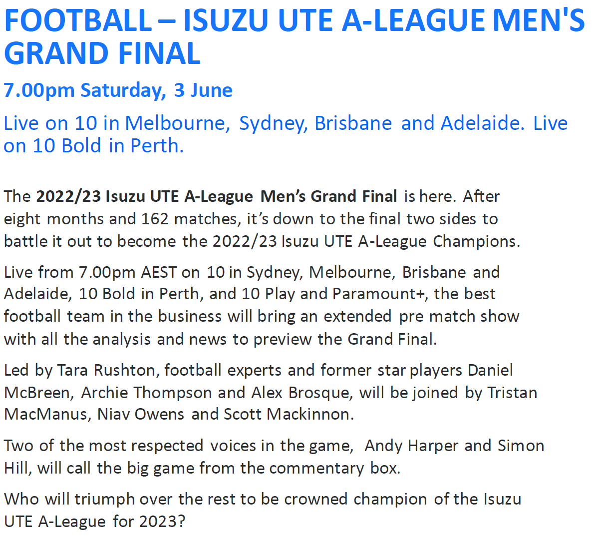 Liberty A-League Grand Final – 10 Bold, 10 Play and Paramount+: