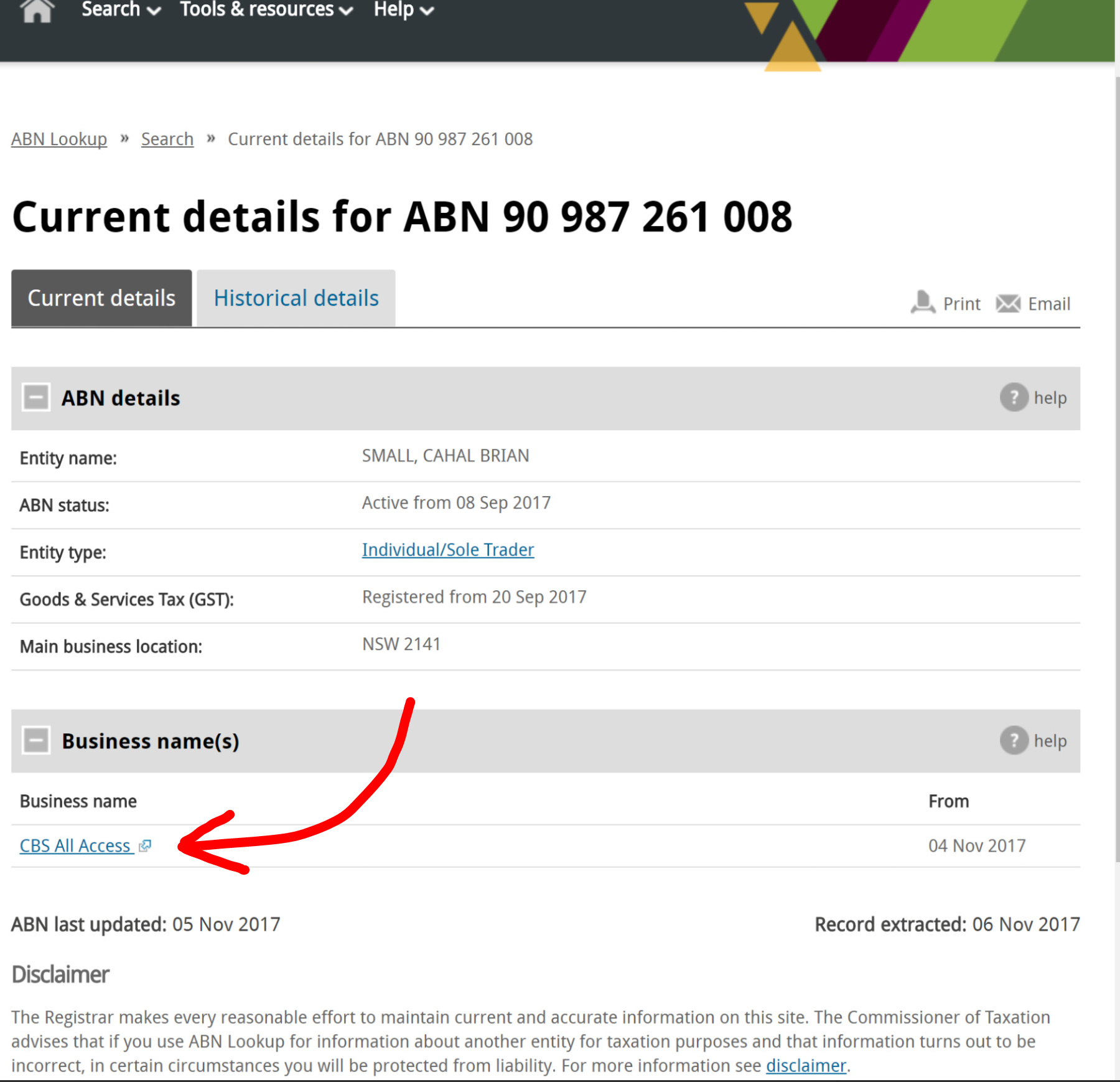 Has anyone seen this before? An ABN associated with an Individual/Sole Trader called “Cahal Brian Small” (initials C.B.S.) has registered several domain names. They recently updated their records with business name “CBS All Access” on 4 November.